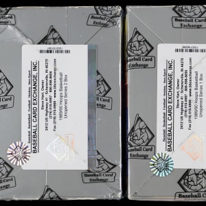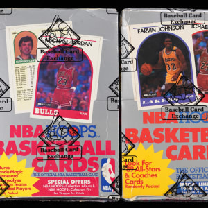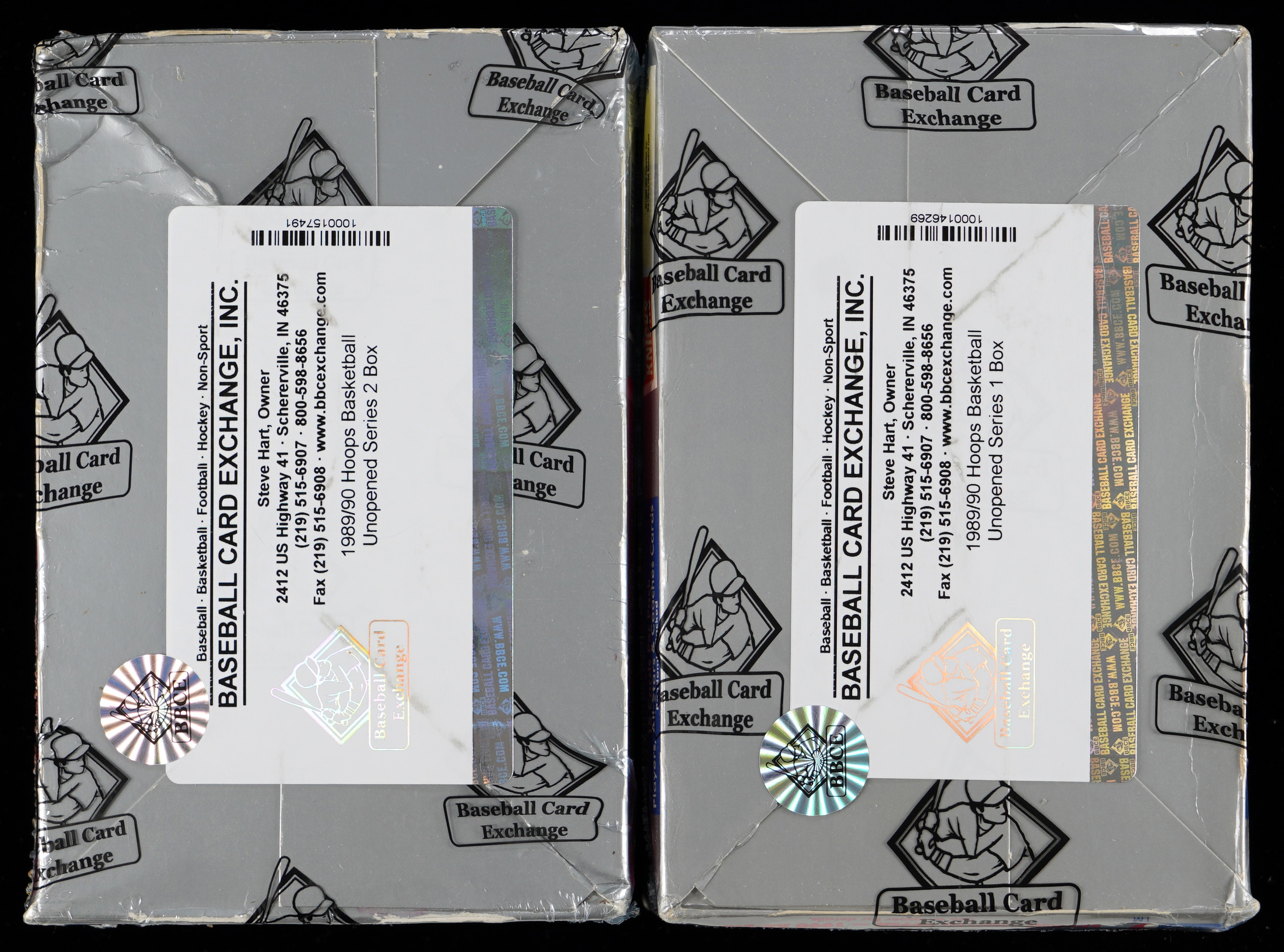"The Admiral" commands the offered pair of 1989-1990 NBA Hoops Basketball Series 1 and Series 1 unopened boxes. Each container will deliver (36) 15-card packs. Find high-grade David Robinson rookie cards along with other greats such as Charles Barkley, Larry Bird, Magic Johnson, Michael Jordan, Akeem Olajuwon, and many others! Each box comes shrink-wrapped by Baseball Card Exchange (owned by Steve Hart, the foremost expert on unopened material).