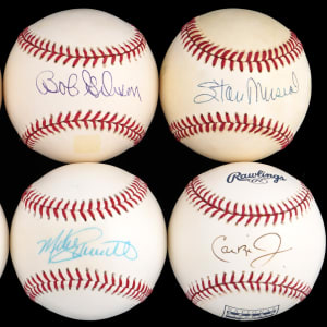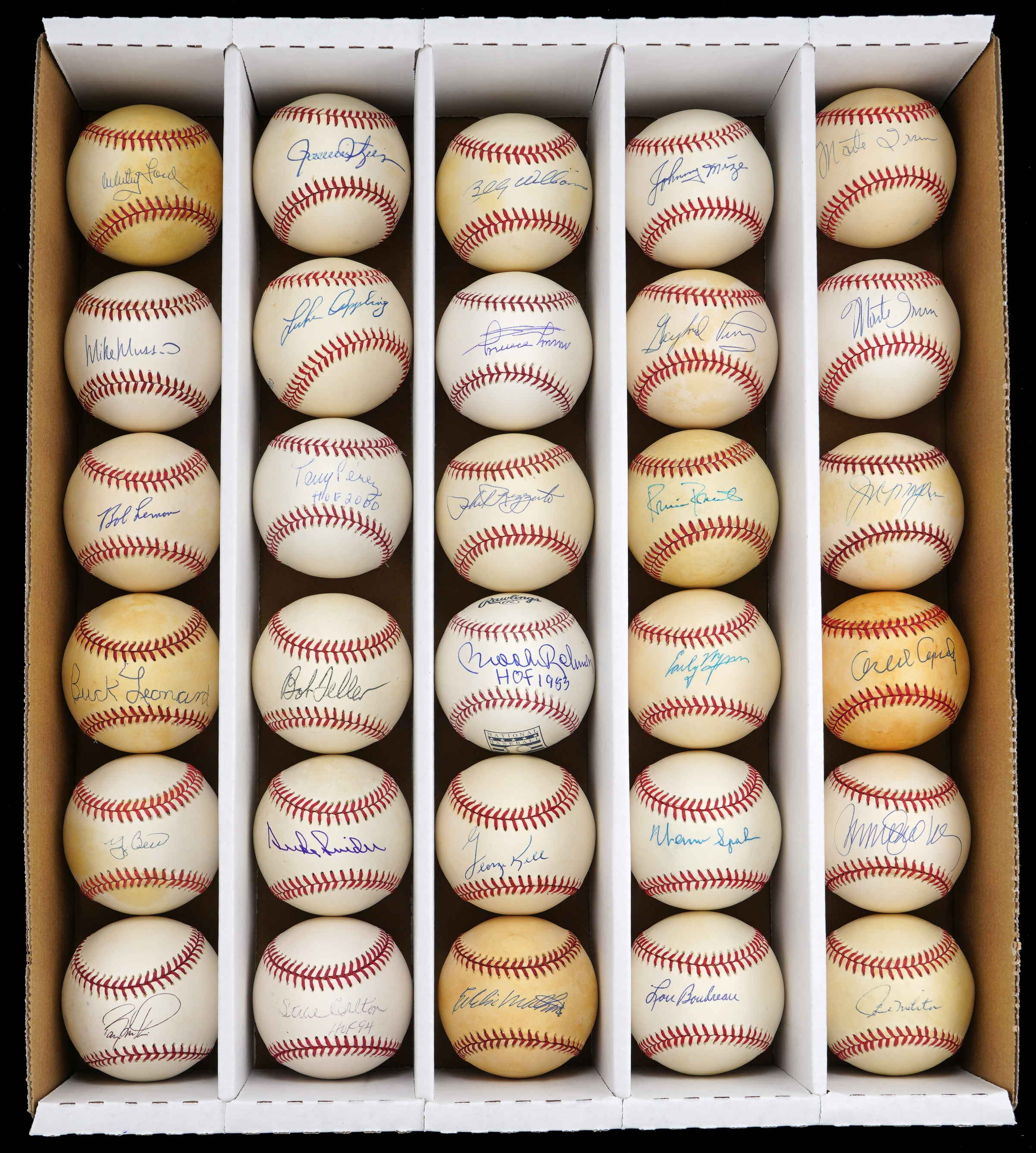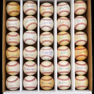 These (36) single-signed Hall of Famer baseballs have signatures that average (“8 to 10”). The balls average 70% near white to white and 30% creamy or toned.