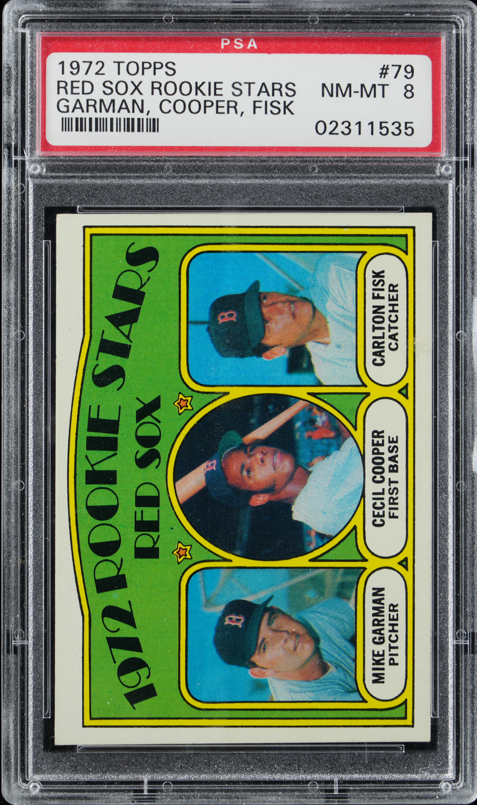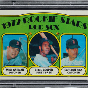 Graded NM-MT 8 by PSA. The rookie card of Boston Red Sox Hall of Famer Carlton Fisk along with five-time all-star Cecil Cooper (and poor Mike Garman).