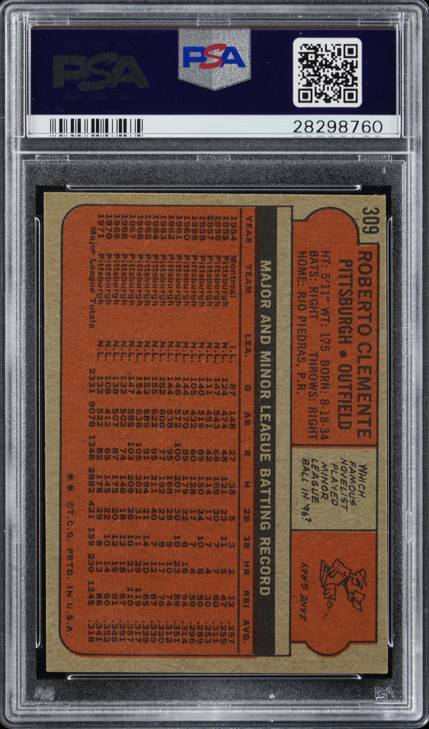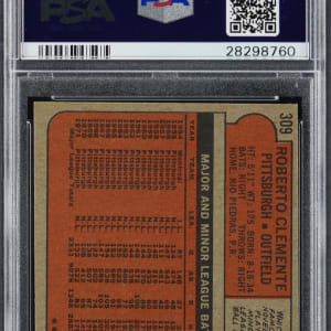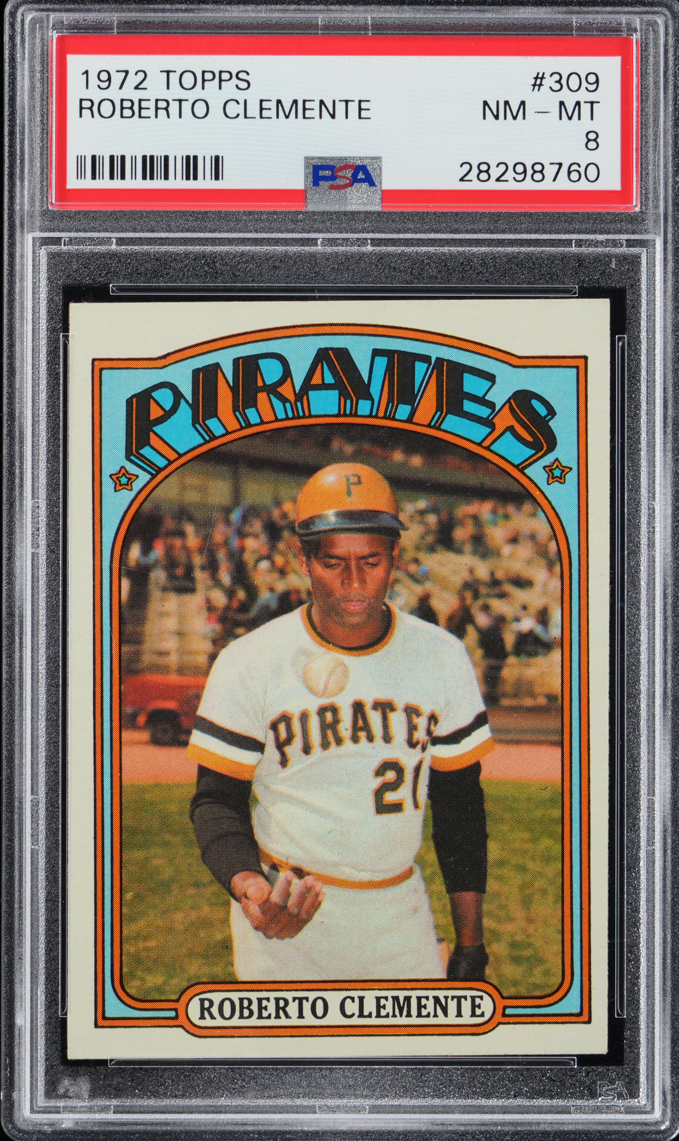 Graded NM-MT 8 by PSA. From the season in which he notched his 3,000th career hit arrives this high-grade 1972 Topps #309 Roberto Clemente. Pittsburgh Pirates Hall of Famer.
