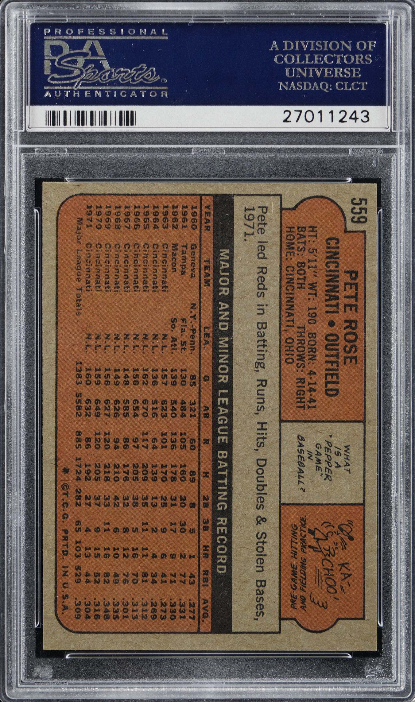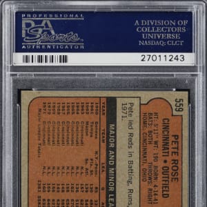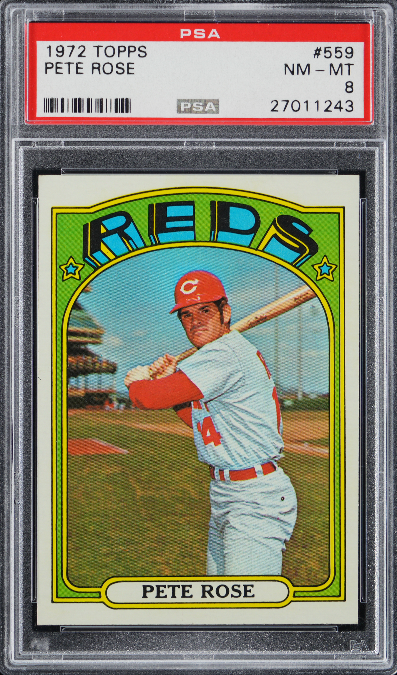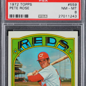 Graded NM-MT 8 by PSA. "The Big Red Machine" churns along with the offered 1972 Topps #559 Pete Rose high-grade example.
