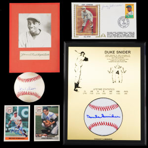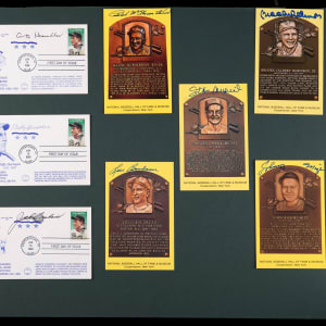 16x20 Display with Yellow Hall of Fame postcards and FDC's signed by (8) with Boudreau, Kiner, Mize, Musial, B. Robinson and First Day Covers of Chandler, Conlon and Herman. Signatures average (“9-10”).