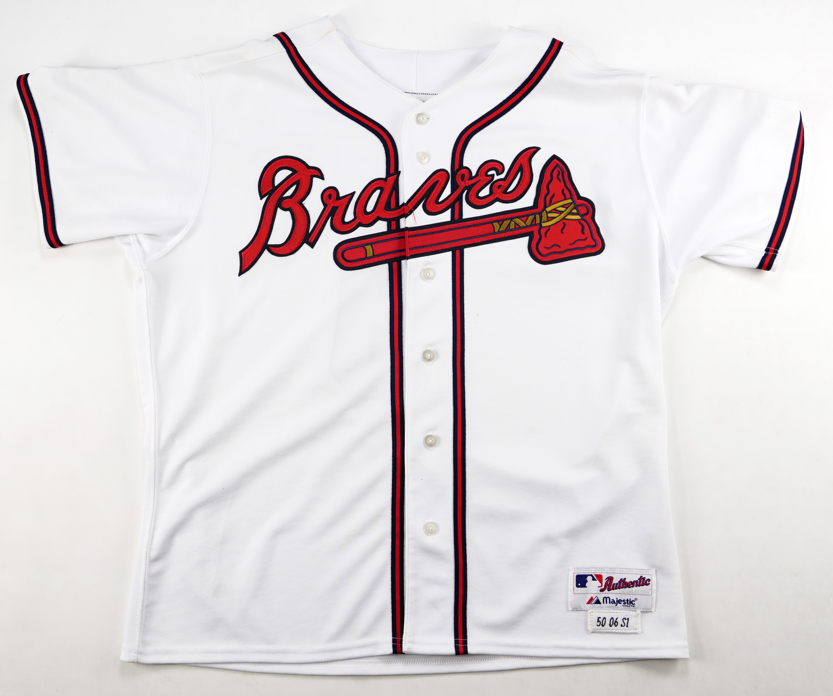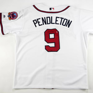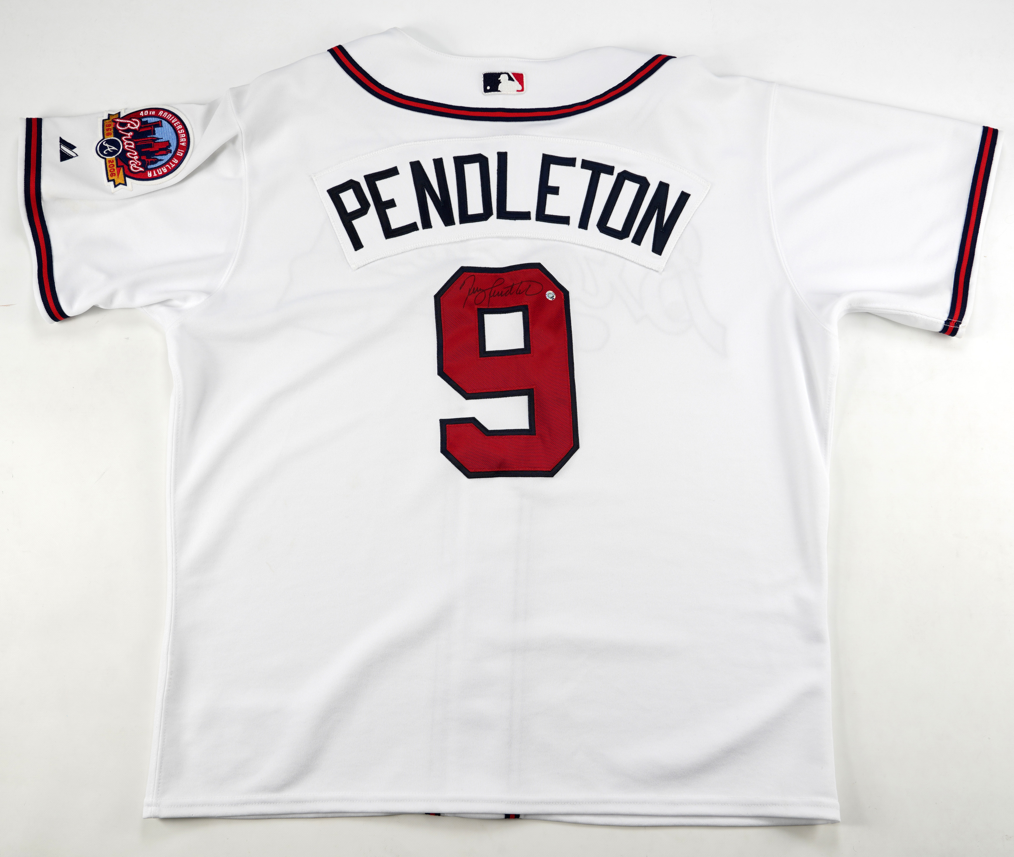 This Terry Pendleton white Atlanta Braves home jersey has the MLB Authentic Majestic Athletic tag in the shirttail with the tagging “50 06 S1.” It has the “Atlanta Braves 40th Anniversary in Atlanta 1966-2006” patch on the left shoulder and it is signed on the back on the “9” by Terry Pendleton (“7-8”). It has an MLB hologram, but the hologram was not entered into their system correctly, reads "Wilson Betemit."