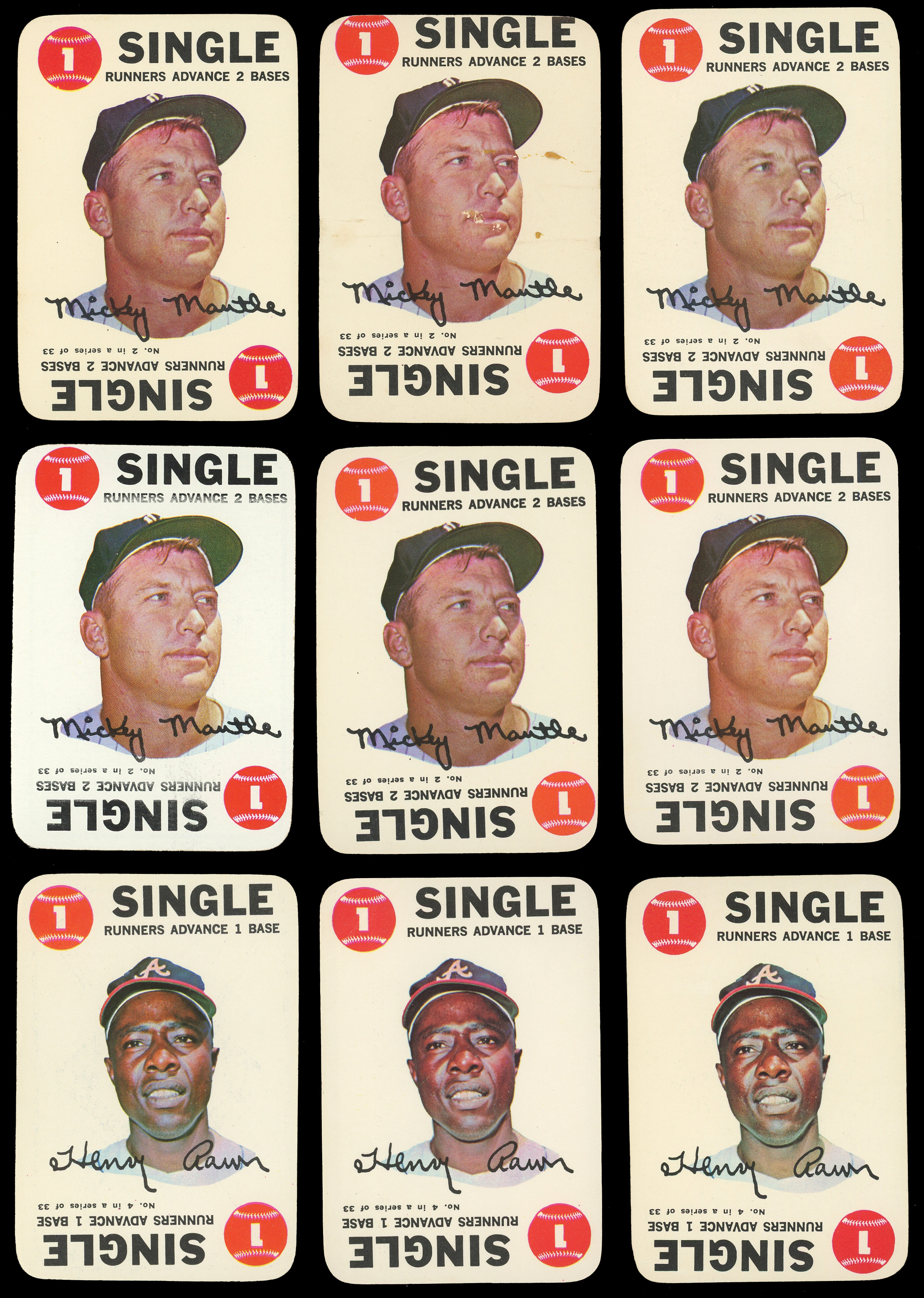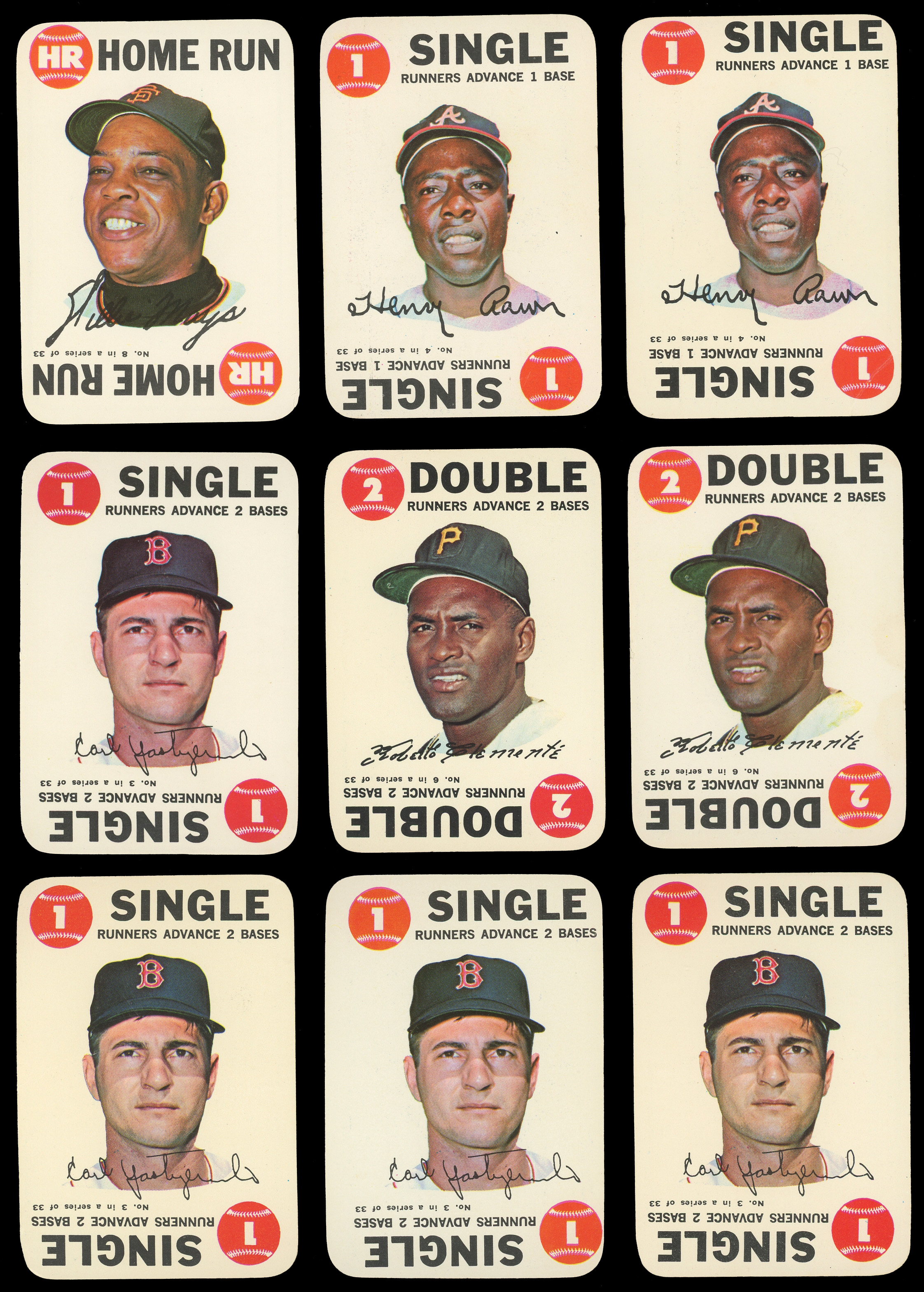 Seize the offered 1968 Topps Game collection of (122) cards featuring a generous supply of Hall of Famers and stars. These clean pack inserts generally present in the (EX to EX-MT) range with some better or lesser. Keys include: (6) #2 Mantle (average EX), (5) #3 Yastrzemski (average EX), (5) #4 Aaron (average EX), (5) #5 Killebrew (average EX-MT), (2) #6 Clemente (EX-MT, EX), (5) #7 F. Robinson (average EX-MT), #8 Mays (EX), (7) #19 Santo (average EX-MT) and #30 Rose (GD).