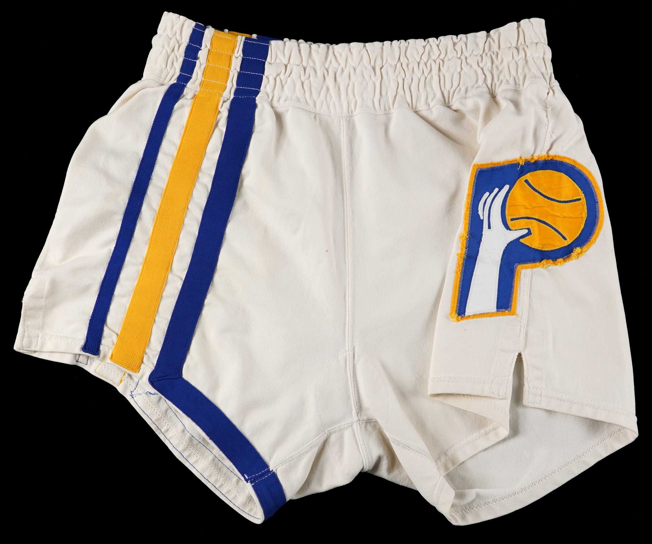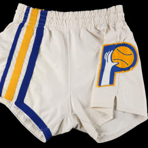 These size 36 Wilson Indiana Pacers shorts have a “34” tag on the Wilson tag as well as “41” written to the side. The shorts have lots of game-use, including Pacers ABA championships in 1972 and 1973. The style is from 1972-1975. The small yellow stripe introduced in 1972, went to a larger swath in 1975/76. The original number is #34 (Mel Daniels), the secondary number is #41 (Len Elmore/rookie year 1974/75). Consignor said he purchased them under the belief that they were Len Elmore's rookie year shorts, possibly passed down from Hall of Famer, Mel Daniels.