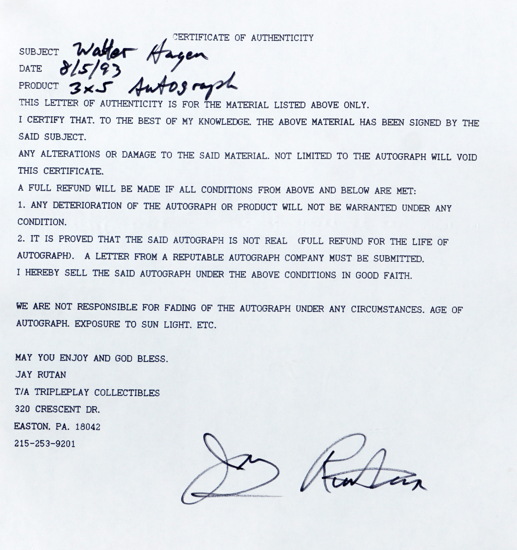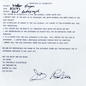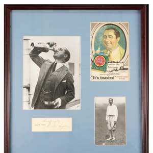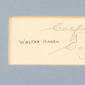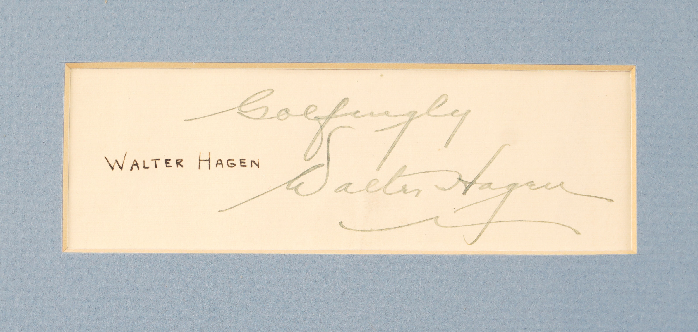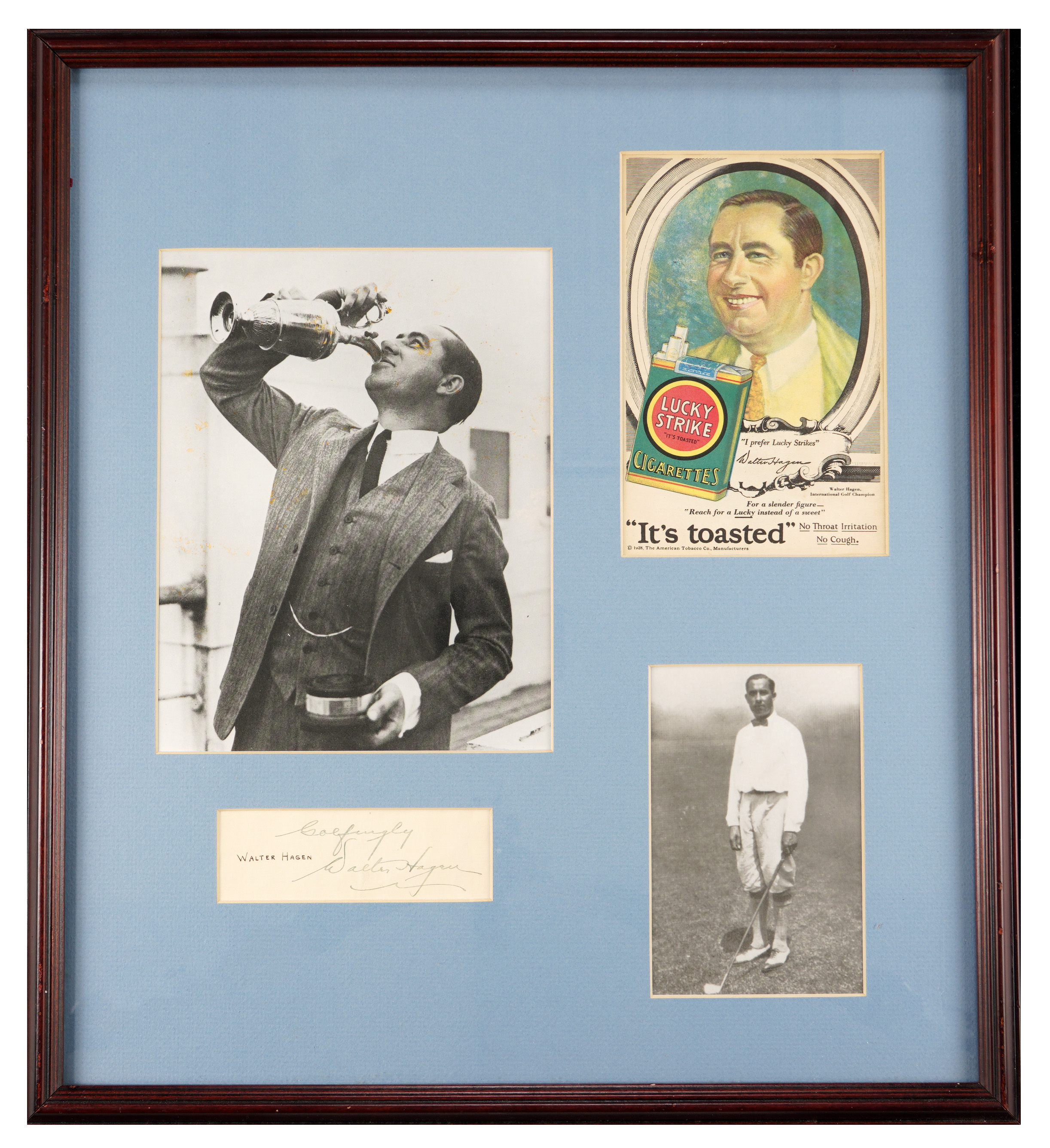 Golf great Walter Hagen didn't just win big, he did it in style and had fun doing it. Hagen (d.1969) began his career at a time when professional sportsmen often took a back seat to amateurs. His championship play, charismatic nature and work with Wilson on developing equipment did as much or more for the advancement of the game as any other golfer of his day. This majestic 18x20 framed display captures Hagen's triumphant nature in fine fashion. A ("7-8") strength Hagen signature cut at bottom left includes the salutation "Golfingly" and a photo located above the autograph sees the dapper Hagen drinking from the Claret Jug in celebration of winning the British Open Championship. Also incorporated in this rousing ensemble piece are a photo of Hagen on the golf course and an advertisement for Chesterfield Cigarettes. Though the frame shows moderate wear, it remains serviceable and the autograph cut and photos present in excellent condition. Frames included with lots: while we make every effort to protect the frames included in these lots during pre-auction storage and post-auction shipping, we are not responsible for any damage to the frames themselves, and no refunds will be given due to frame damage. Auction LOA from James Spence/JSA. The size/weight of this item requires that there will be an additional shipping charge for this lot.