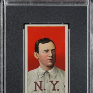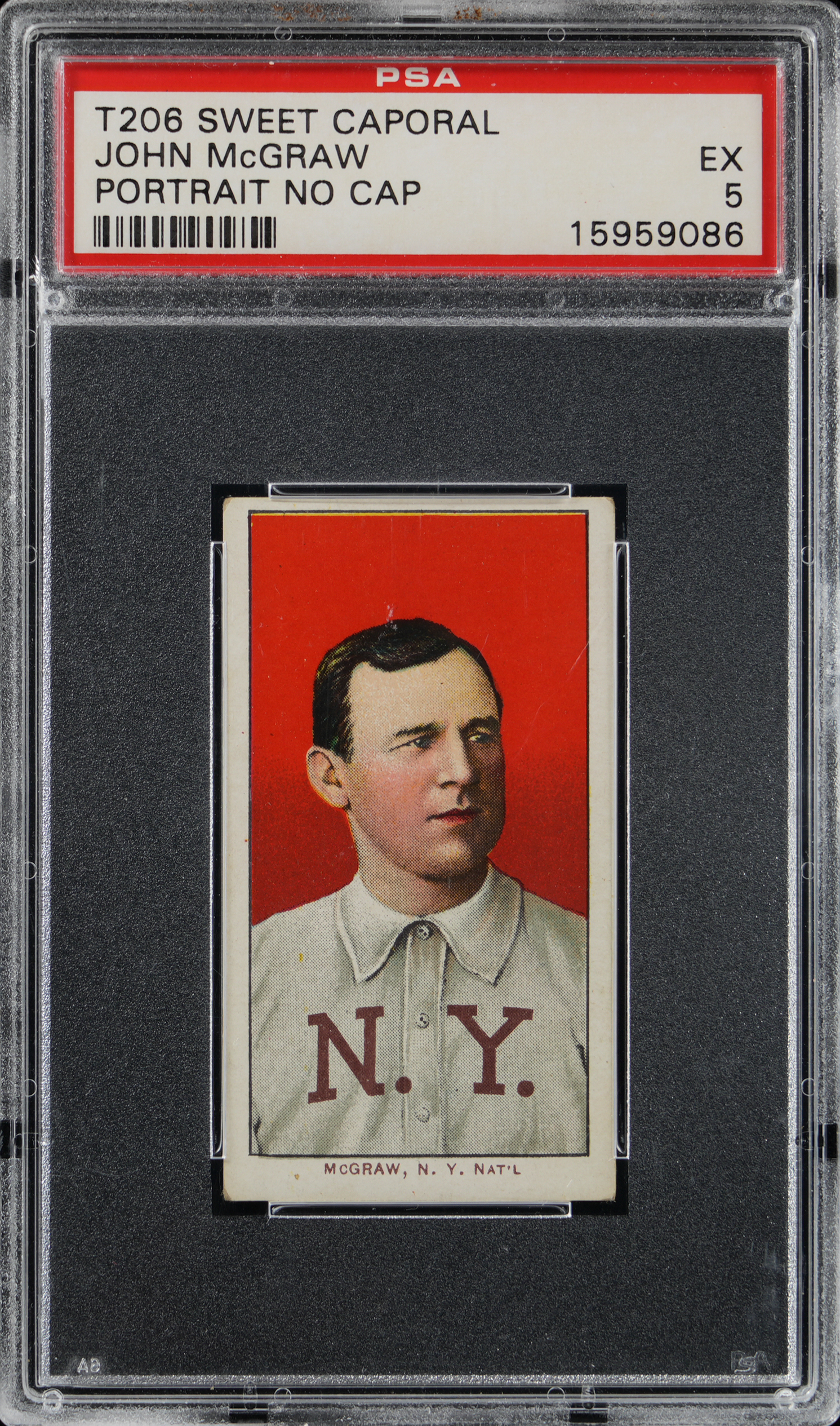 Graded EX 5 by PSA. The surly "Muggsy" casts an intense glare on the offered 1909-1911 T206 White Borders John McGraw (Portrait, No Cap) pose. The New York Giants Hall of Fame skipper is framed by moderately touched corners, creamy white edges and intense surface colors. The Sweet Caporal 150 Subjects advertising back is sparkling clean.