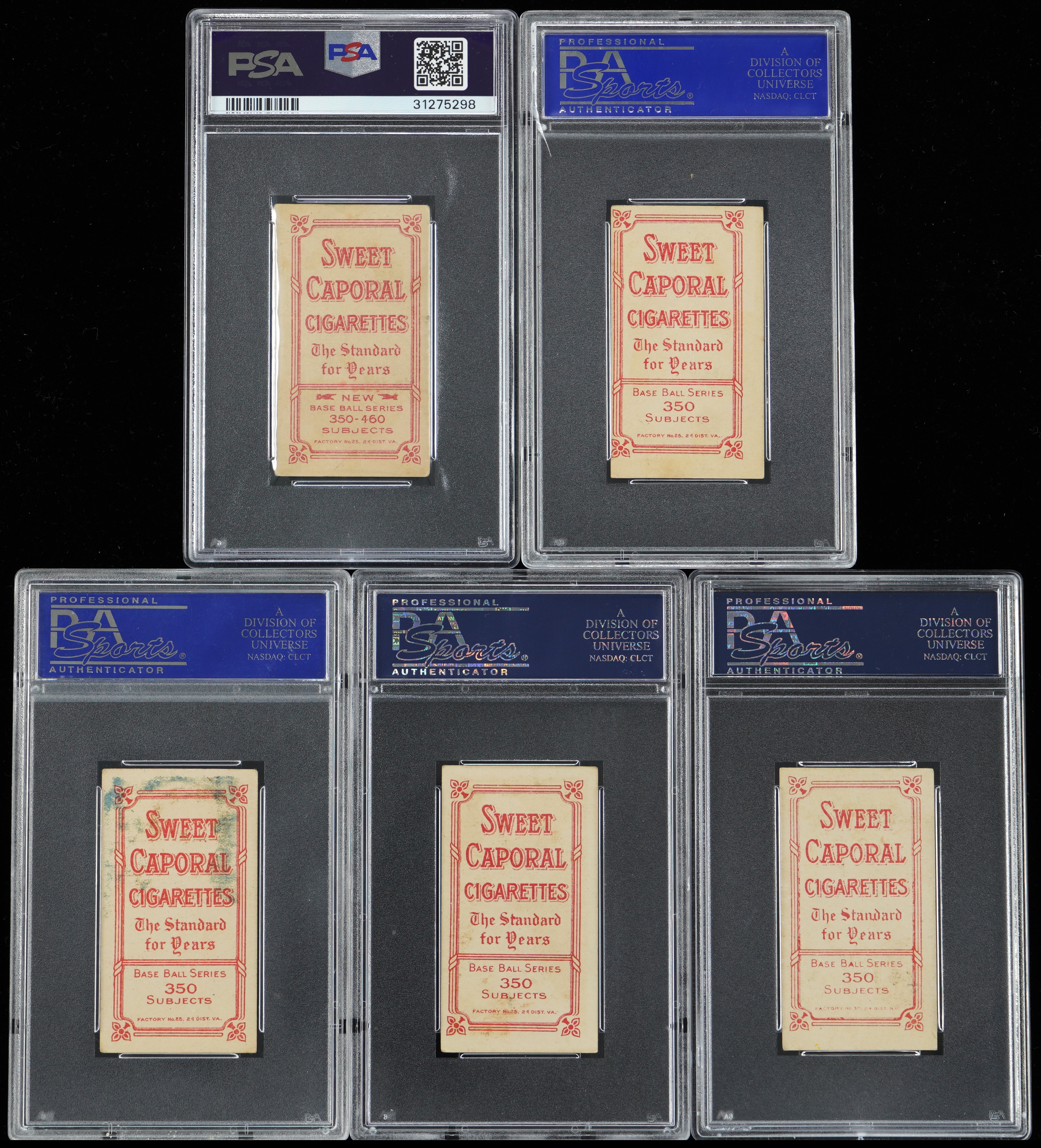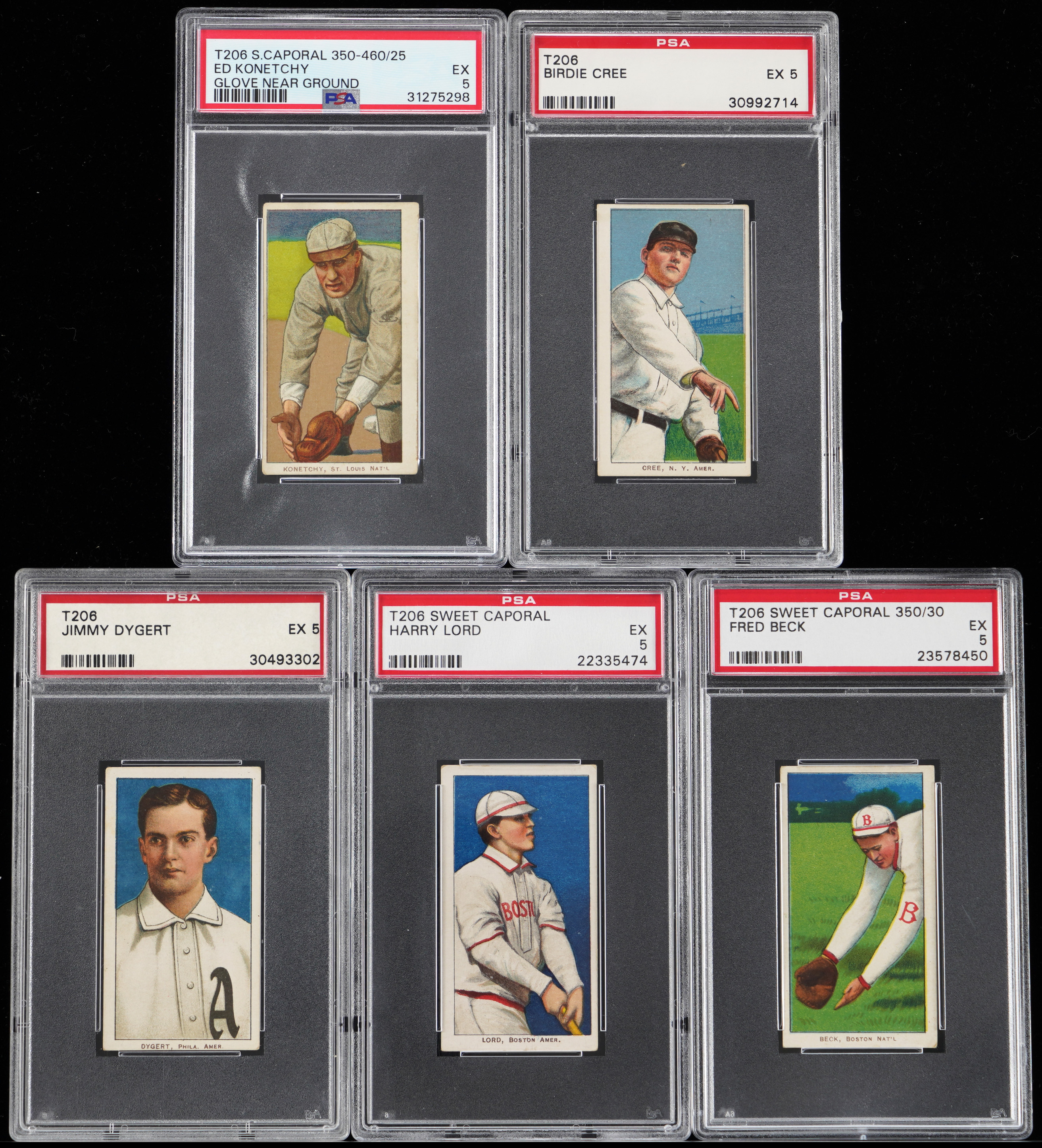 Each graded EX 5 by PSA with Sweet Caporal advertising backs. Boost your "Monster" gallery with these (5) clean 1909-1911 T206 White Border relics. Includes: Beck, Cree, Dygert, Konetchy (Glove Near Ground) and Lord.