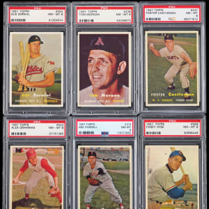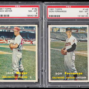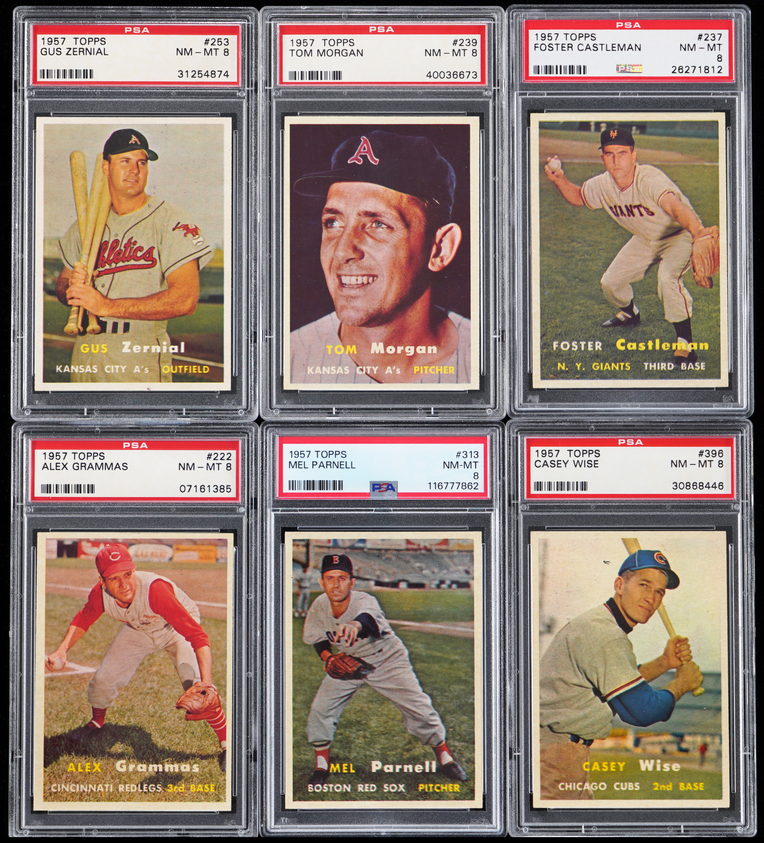 Straight 8s! Each graded NM-MT 8 by PSA with no qualifiers. Razor-sharp collection of (9) different 1957 Topps high-grade singles. Includes: #46 B. Miller, #146 Ferrarese, #162 Meyer. #222 Grammas, #237 Castleman, #239 T. Morgan, #253 Zernial, #313 Parnell and #396 Wise.