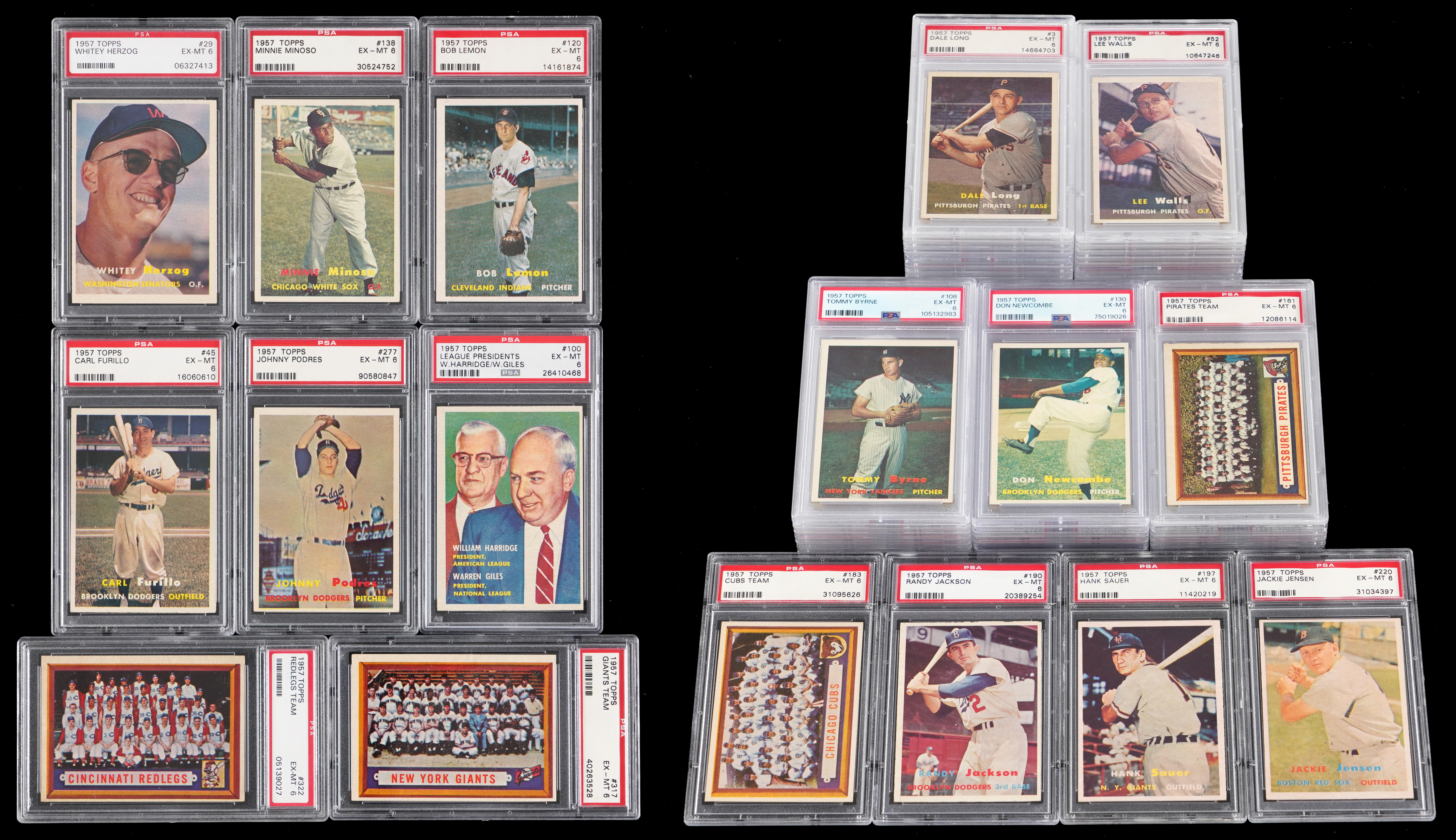 Each graded EX-MT 6 by PSA. Crisp compilation of (112) different 1957 Topps singles featuring (13) Hall of Famers, additional stars, (22) tougher fourth series, and a contest card. This starter set includes the following: