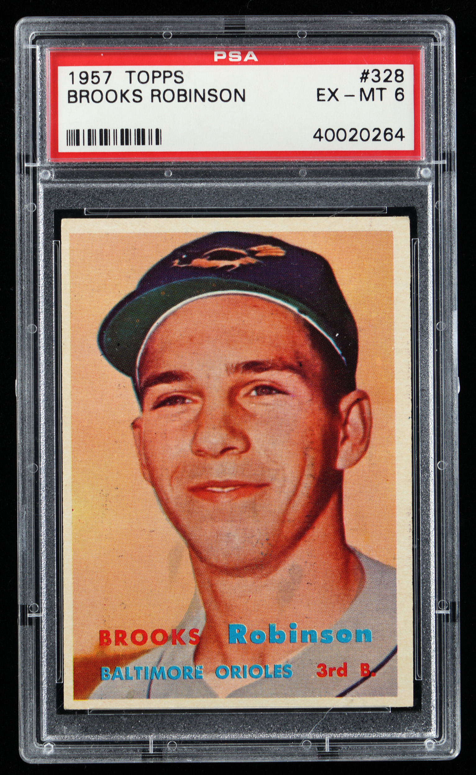 Graded EX-MT 6 by PSA. "The Human Vacuum Cleaner" stars on the offered 1957 Topps #328 rookie card. This tougher fourth series premiere of the Baltimore Orioles Hall of Famer is quite attractive with four barely touched corners, crisp factory edges and fresh surface accents. The reverse touting Brooksie's prospect status is wax stain-free.