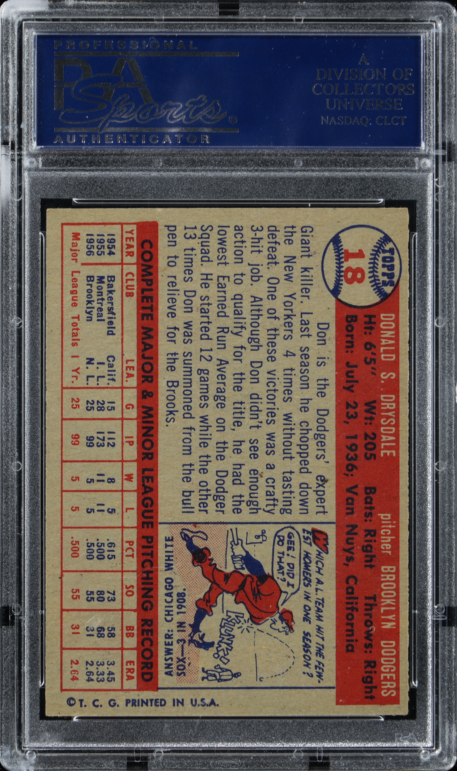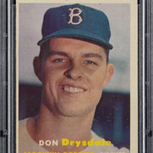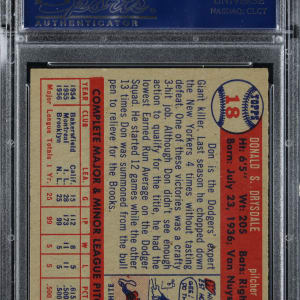 Graded EX-MT 6 by PSA. The dandy Brooklyn Dodger Hall of Famer is pictured as a legend-in-the-making on the offered 1957 Topps #18 Don Drysdale rookie card.