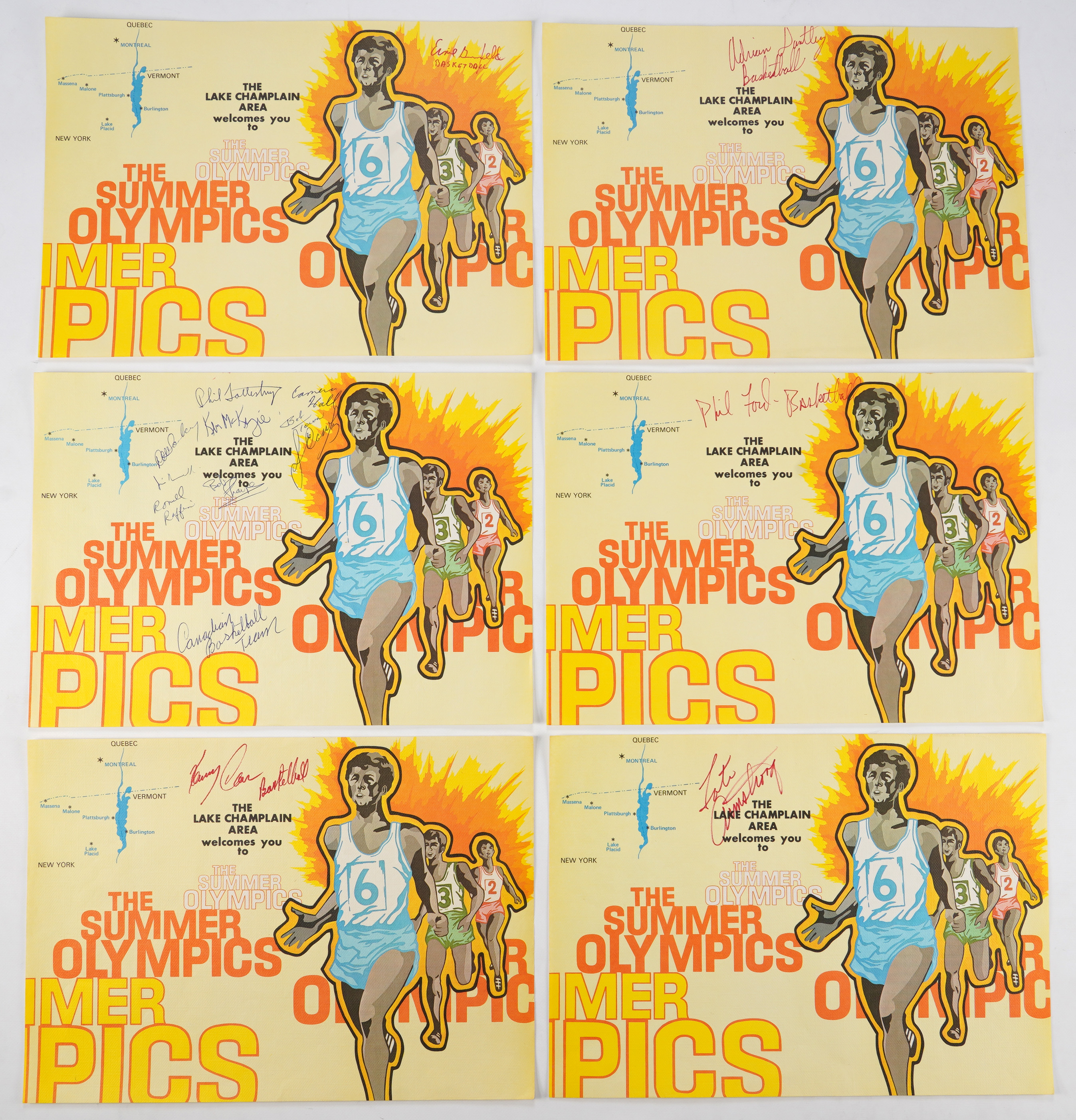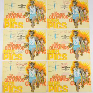 Autographs come in many forms. These four lots feature 11x14 illustrated paper placemats from the Lake Champlain area of the 1976 Montreal Summer Olympics. The placemats average Excellent condition with bold (“8 to 10”) signatures. Most of the athletes inscribed their event and significant statistics. With a few exceptions, the players are all different.