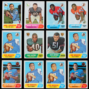 1968 Topps: (400+ cards, average EX to EX-MT) with (4) #25 Meredith (average EX), (4) #49 Warfield (average VG-EX), #75 Sayers (EX), #127 Butkus (EX), (2) #149 Kemp (EX, VG-EX), #161 Tarkenton (EX), #162 Ditka (VG-EX), #171 Dawson (GD), (2) #173 F. Little RC (EX, VG-EX);