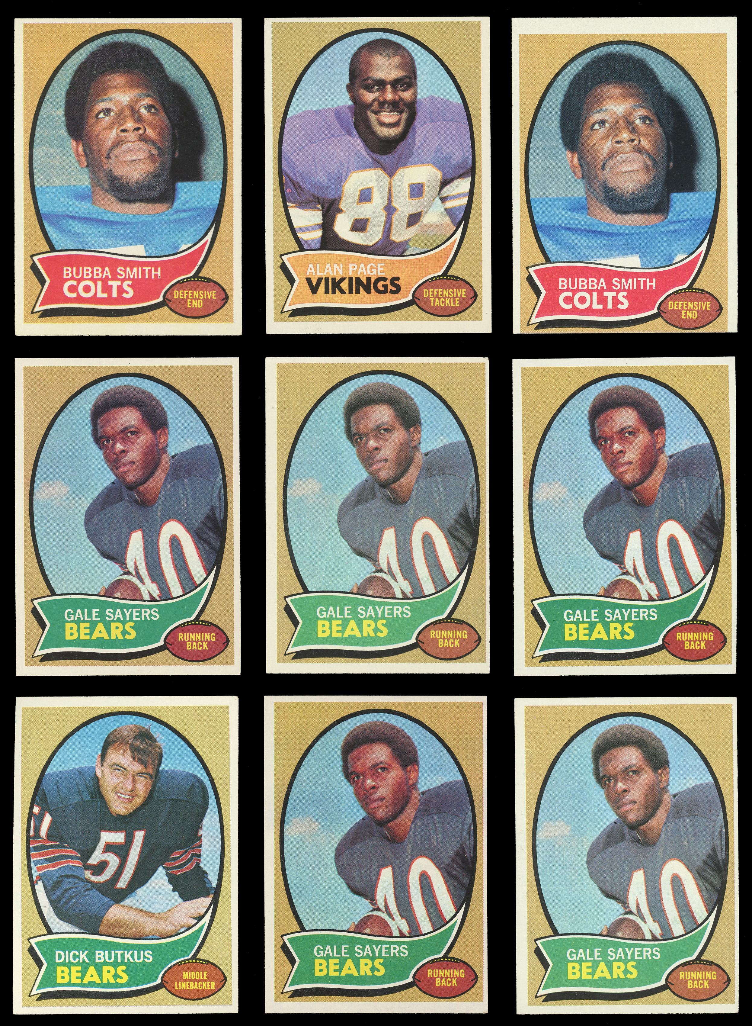 Sack your bidding competition with the offered 1970 Topps Football collection of (750+) cards hallmarked by (100+) Hall of Famers. This merger-era gallery generally presents in the (EX to EX-MT) range with some better or lesser. Highlights include: (2) #1 Dawson (VG, GD), (3) #10 Griese (NM-MT, NM, EX-MT), (5) #25 Stenerud RC (average EX-MT), (3) #30 Starr (NM, EX-MT, GD), (3) #43 Bethea RC (EX, VG-EX, VG), (4) #59 Page RC (average EX), (5) #70 Sayers (average EX), (2) #75 Barney RC (NM, EX), (7) #80 Tarkenton (average EX-MT), #90 Simpson RC (VG), (2) #114 B. Smith RC (EX, VG), (4) #151 Mack RC (average EX-MT), #162 Csonka (average EX), (2) #180 Unitas (EX, VG-EX) and (3) #190 Butkus (NM, (2) EX-MT).