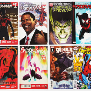 The Amazing Spider-Man #568 Alex Ross Variant (FN), #583 4th printing variant (VF) and #850 (NM); Spider-Man Noir #1 (VF); Ultimate Comics All-New Spider-Man #1 (FN); Miles Morales: Ultimate Spider-Man #1 key debut issue (FN); Edge of Spider-Verse #5 first Peni Parker appearance (NM); Spider-Gwen #1 (VF).