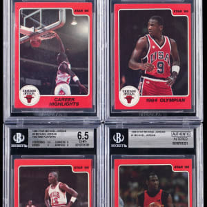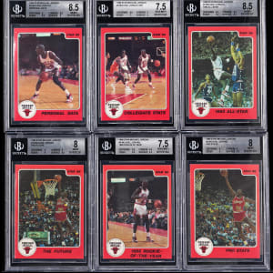 It's MJ all day with the offered 1986 Star Basketball Michael Jordan player set of (10) BGS graded cards. This early career profile of the Chicago Bulls Hall of Fame legend is extremely limited and "a must" for early Jordan die-hards. Includes: BGS NM-MT+ 8.5: (2 cards) with #5 1985 All-Star, #9 Personal Data; BGS NM-MT 8: (2 cards) with #4 Pro Stats, #10 The Future; BGS NM+ 7.5: (2 cards) with #2 Collegiate Stats, #6 1985 Rookie-of-the-Year; BGS NM 7: #7 Career Highlights; BGS EX-MT+ 6.5: #8 The 1986 Playoffs; BGS Authentic-Altered: (2 cards) with #1 Michael Jordan and #3 1984 Olympian.