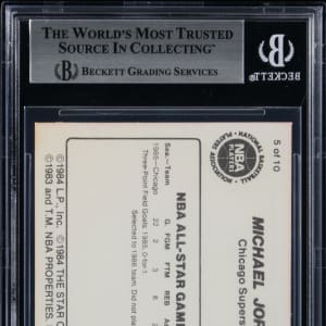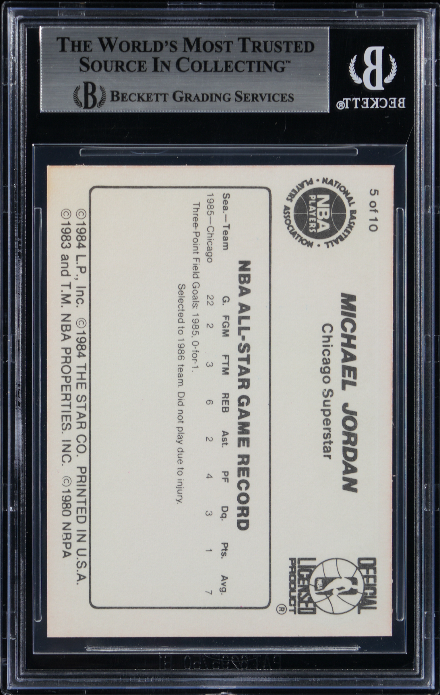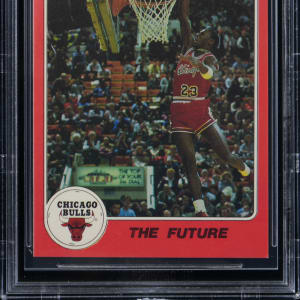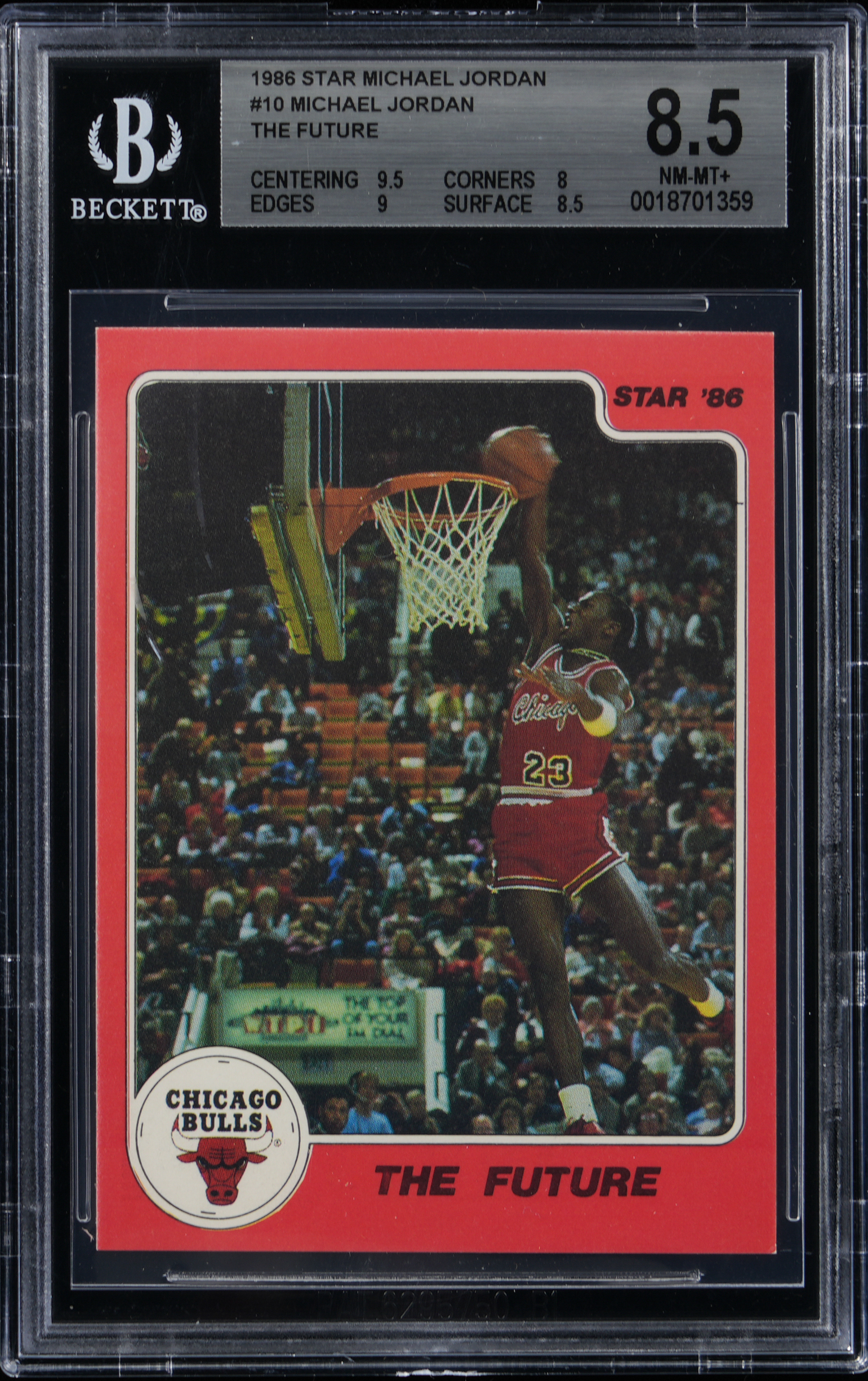 Graded NM-MT+ 8.5 by BGS. Part of a set break from the 1986 Star Basketball Michael Jordan 10-card player issue. The offered #10 version entitled "The Future" has the following sub-grades: Centering: 9.5; Corners: 8; Edges: 9 and Surface: 8.5.