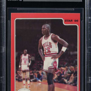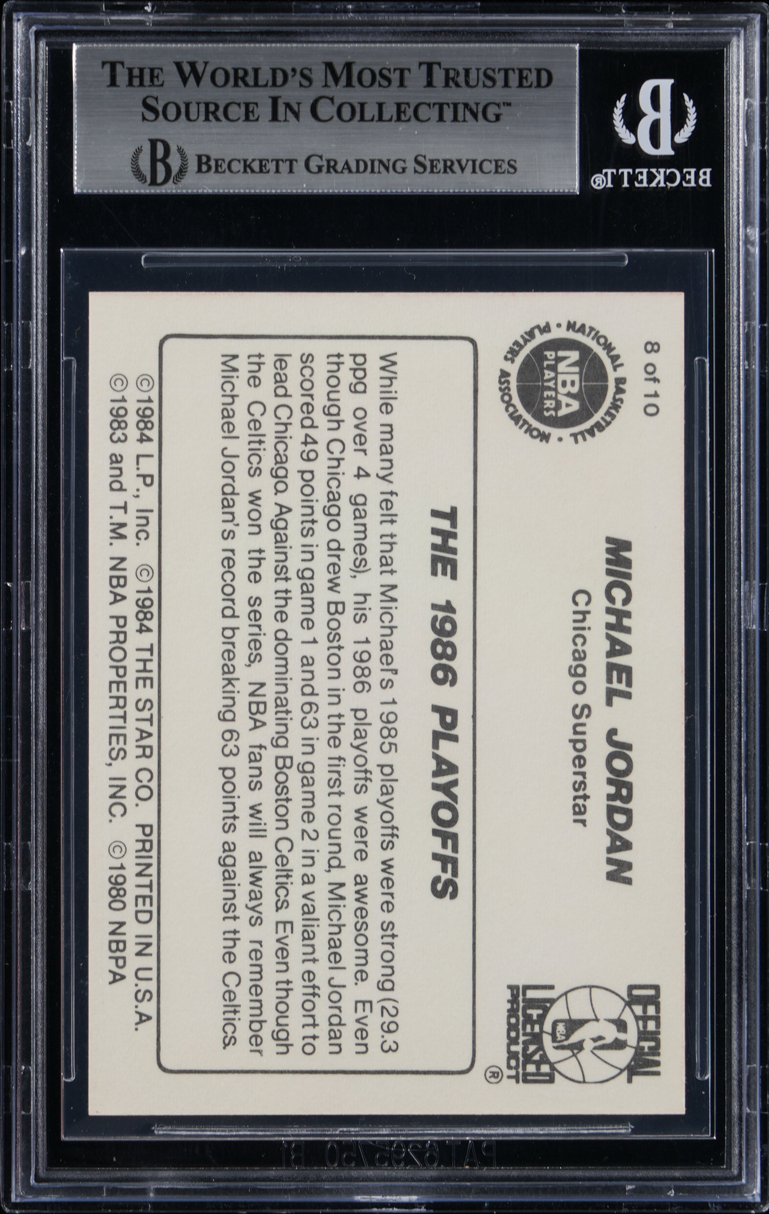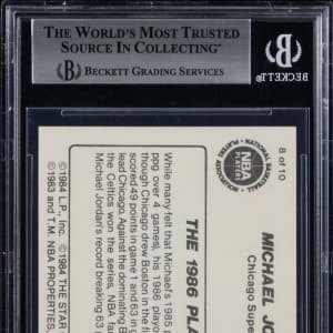 Graded EX-MT+ 6.5 by BGS. Part of a set break from the 1986 Star Basketball Michael Jordan 10-card player issue. The offered #8 version entitled "The 1986 Playoffs" has the following sub-grades: Centering: 5.5; Corners: 9; Edges: 9 and Surface: 9.
