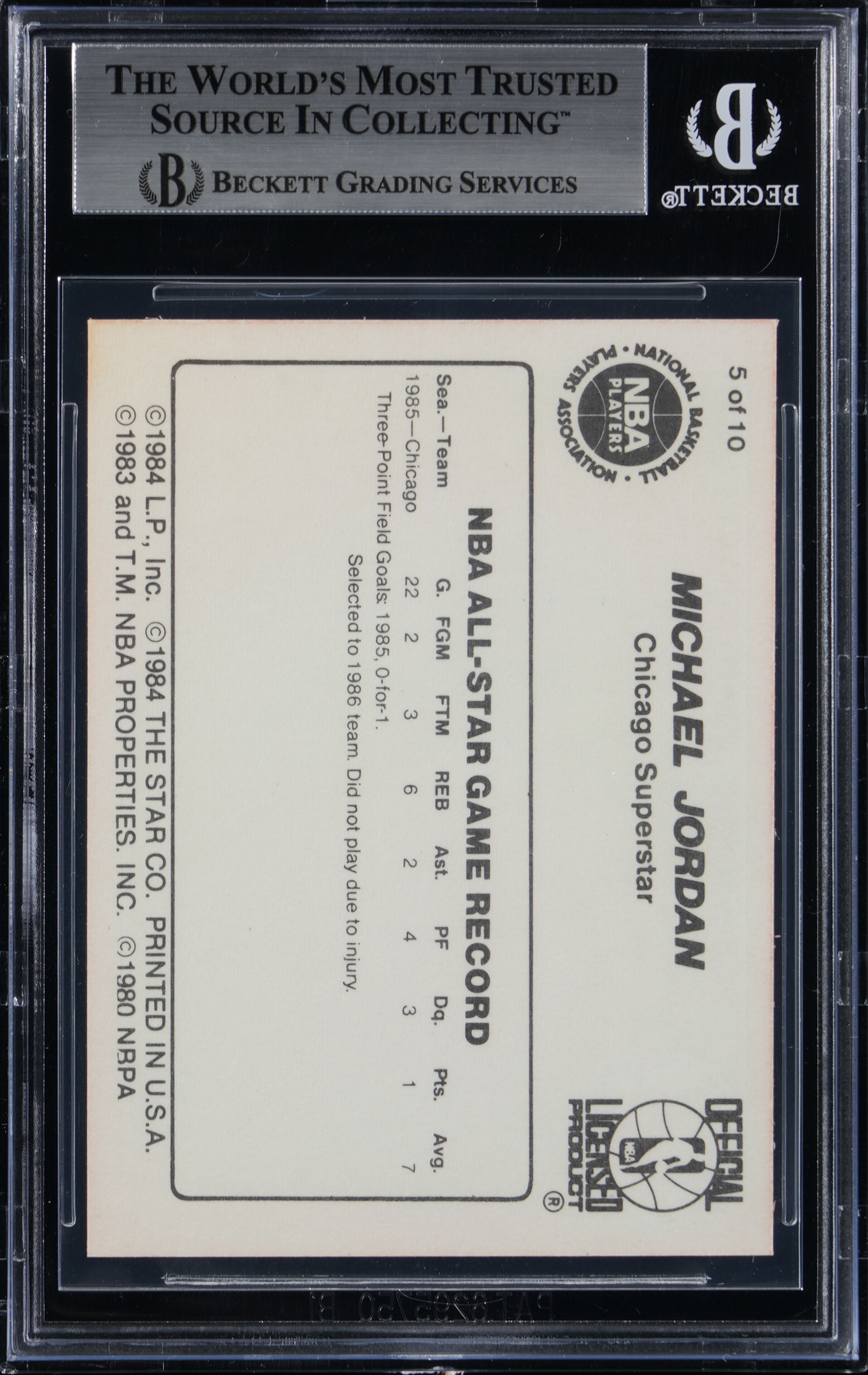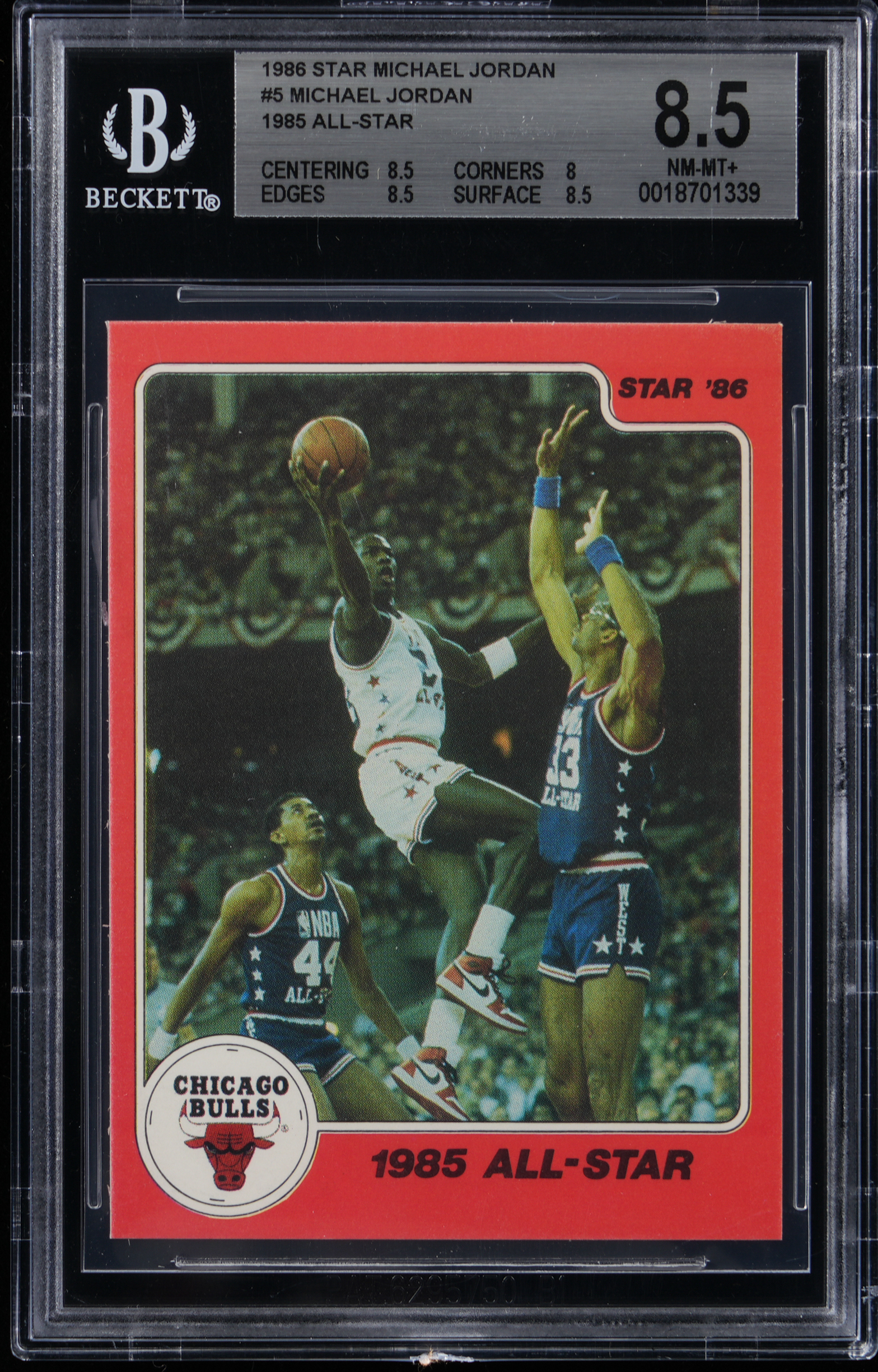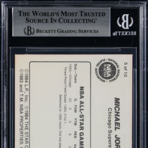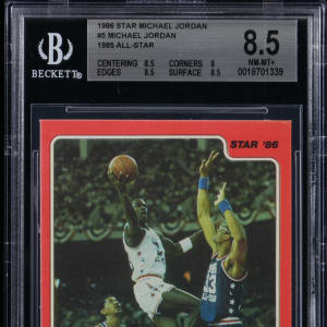 Graded NM-MT+ 8.5 by BGS. Part of a set break from the 1986 Star Basketball Michael Jordan 10-card player issue. The offered #5 version entitled "1985 All-Star" has the following sub-grades: Centering: 8.5; Corners: 8; Edges: 8.5 and Surface: 8.5.