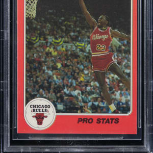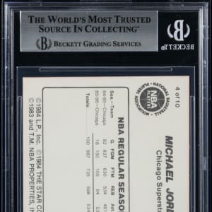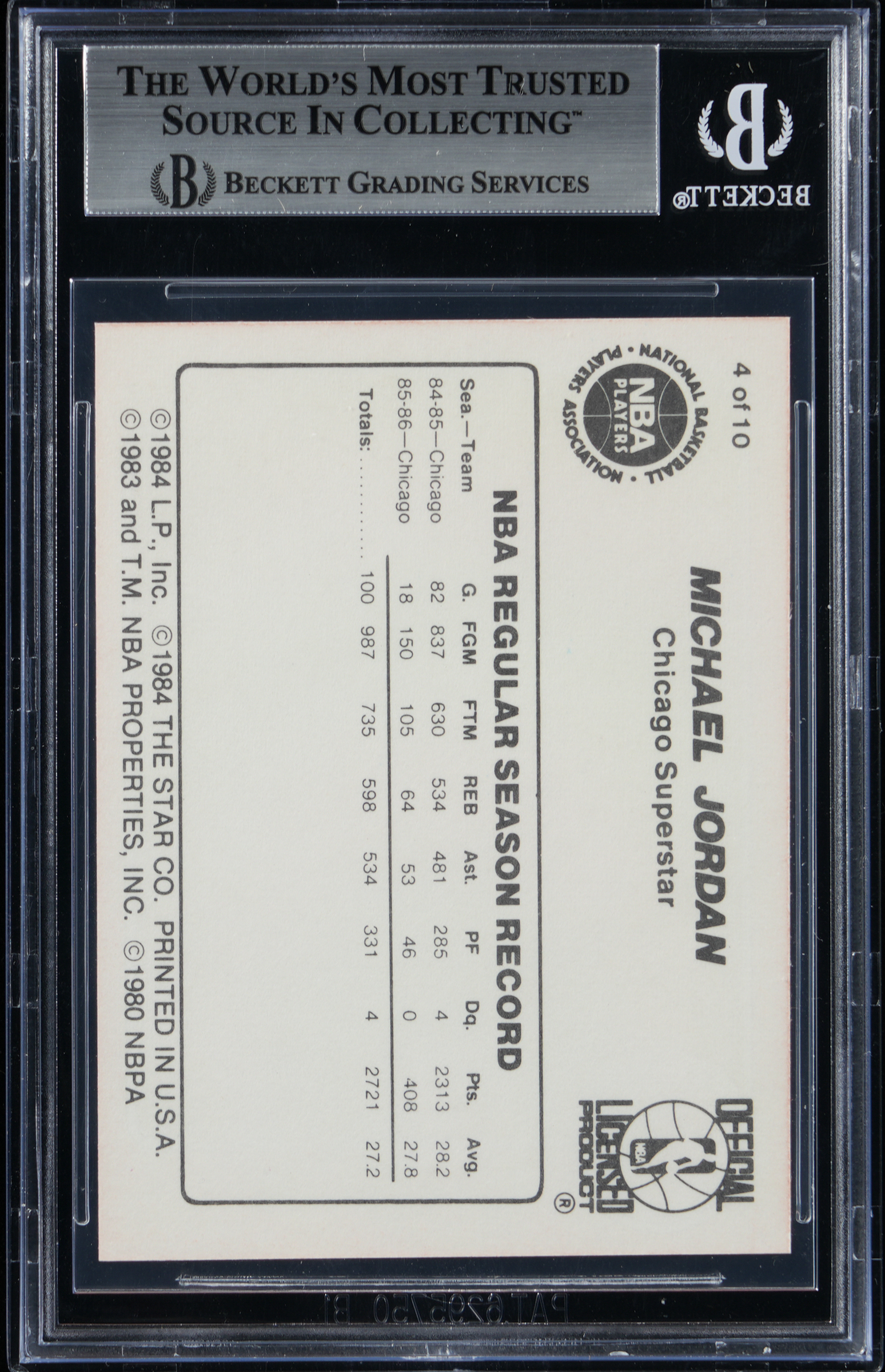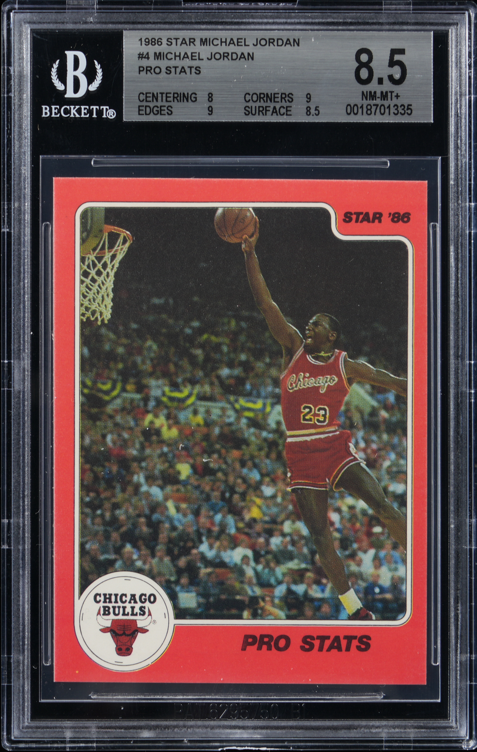 Graded NM-MT+ 8.5 by BGS. Part of a set break from the 1986 Star Basketball Michael Jordan 10-card player issue. The offered #4 version entitled "Pro Stats" has the following sub-grades: Centering: 8; Corners: 9; Edges: 9 and Surface: 8.5.