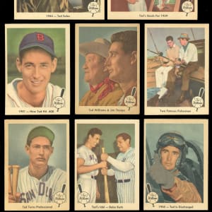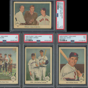 The fame of "Teddy Ballgame" is documented with the offered 1959 Fleer Ted Williams near set of (79/80) cards with four PSA graded. This cardboard chronology of the Boston Red Sox Hall of Famer generally presents in the (EX to NM) range with some better or lesser. Keys include: #1 The Early Years (PSA NM 7), #2 with Babe Ruth (VG), #11 with Jimmie Foxx (PSA NM 7), #17 Hit .400 (EX-MT), #63 All-Star Record (PSA NM 7), #67 Fishing with Sam Snead (NM), #70 with Jim Thorpe (VG), #75 Value to Sox (PSA EX 5) and #80 Goals for 1959 (VG). Missing only #68 Ted Signs for completion.