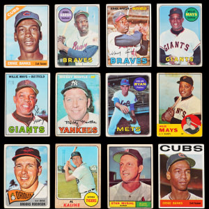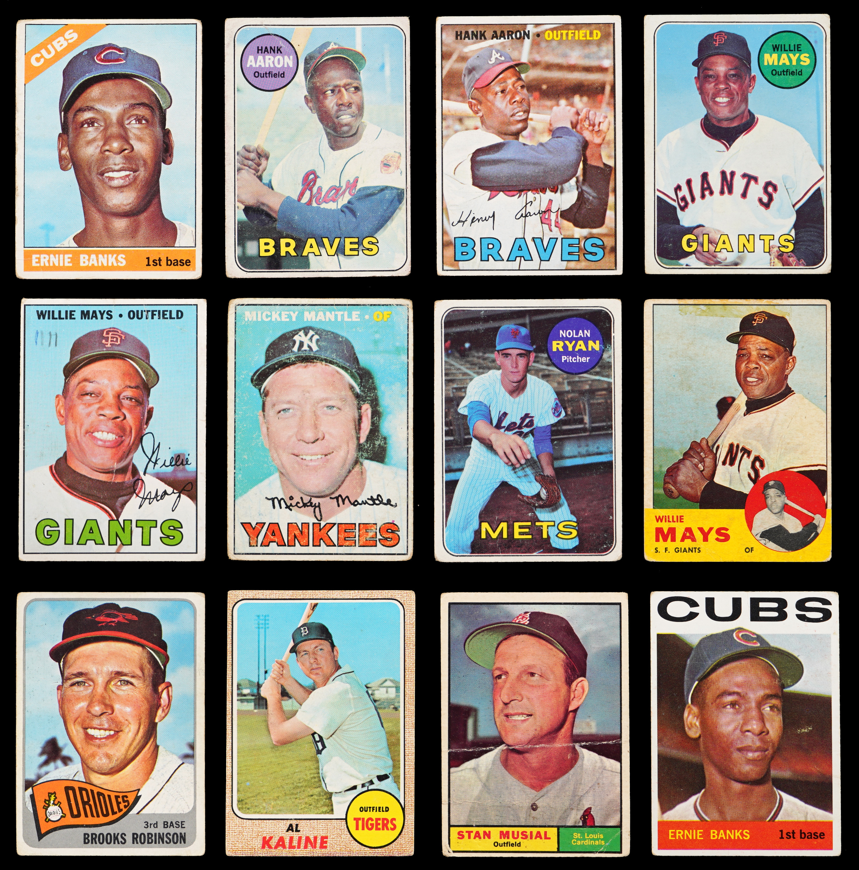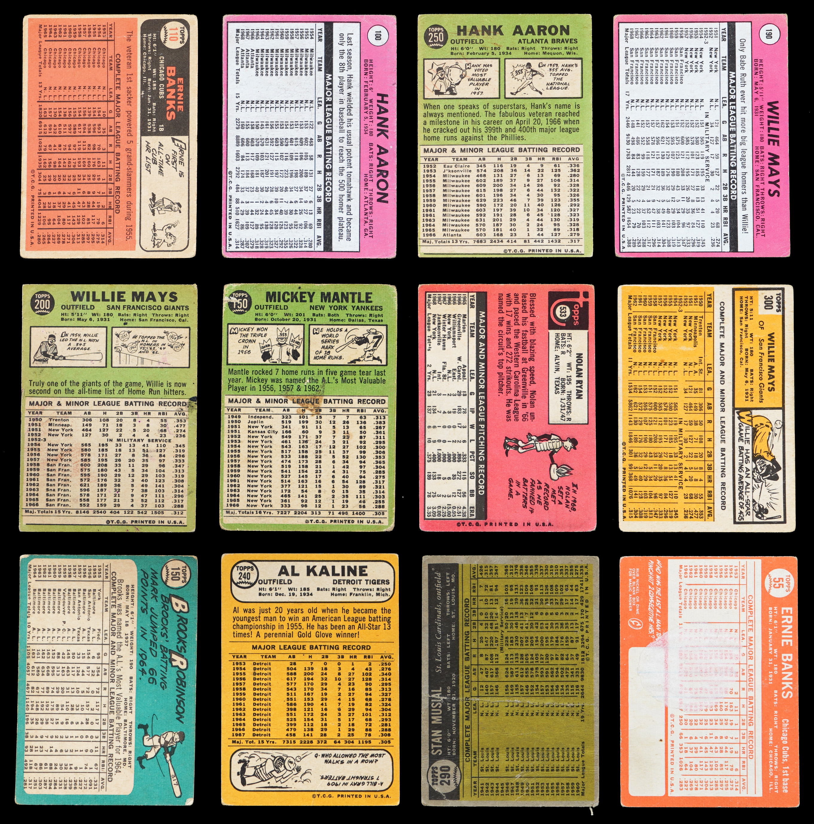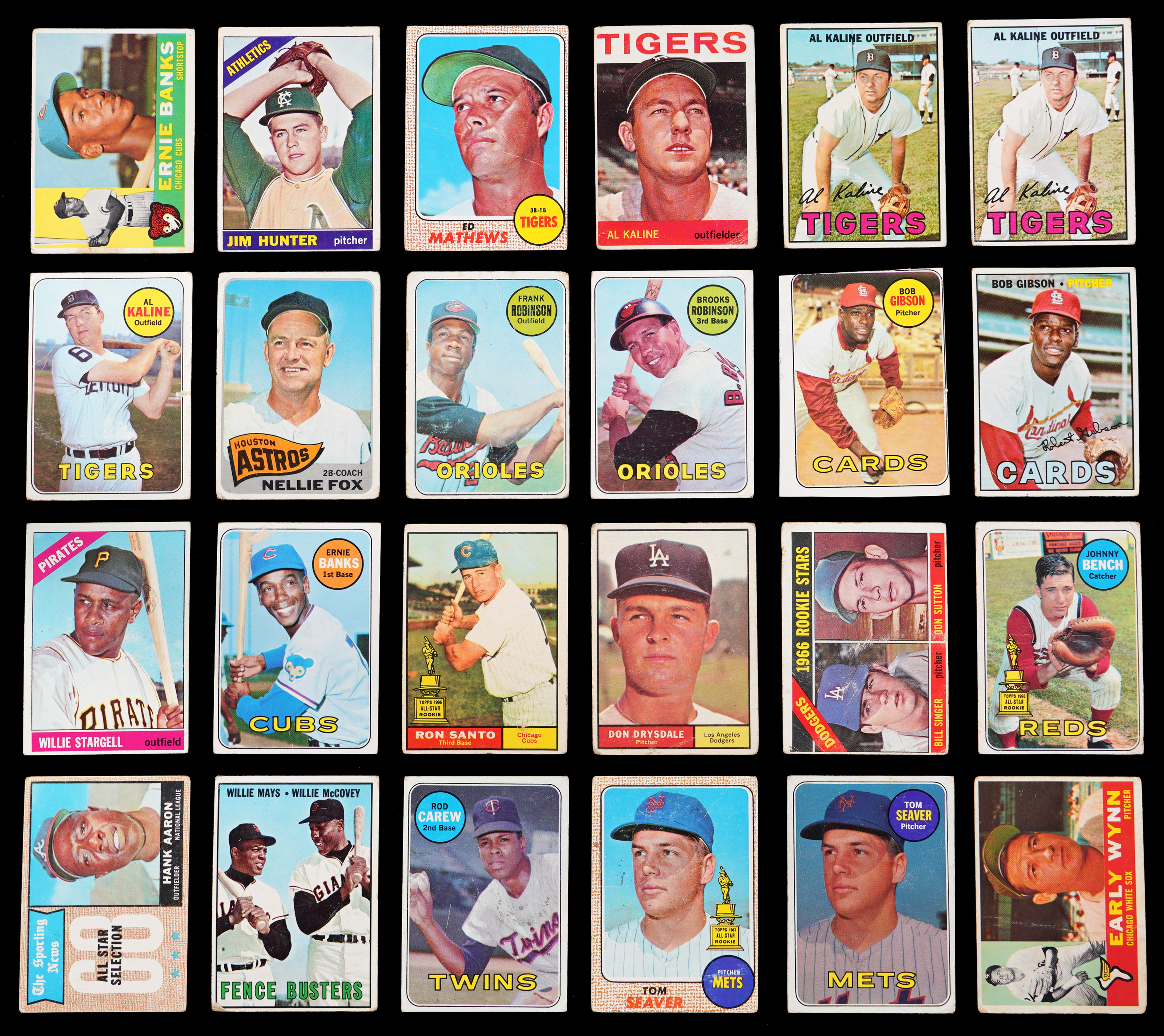 1966 Topps: (300+ cards, average FR to GD) with #36 Hunter (GD), #72 Perez (GD), #110 Banks (PR), #125 Brock (PR), #200 Mathews (PR, reverse paper loss), (2) #255 Stargell (GD, FR), #288 Sutton RC (FR), #420 Marichal (GD);