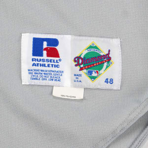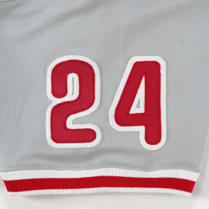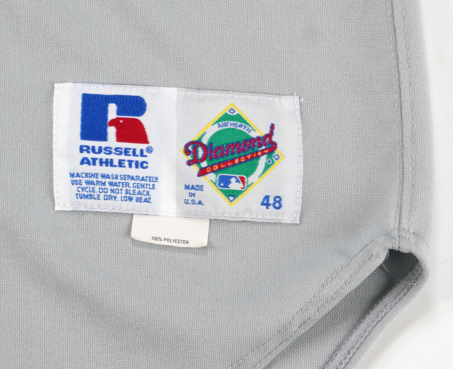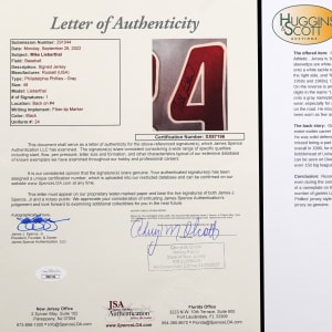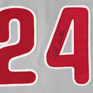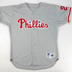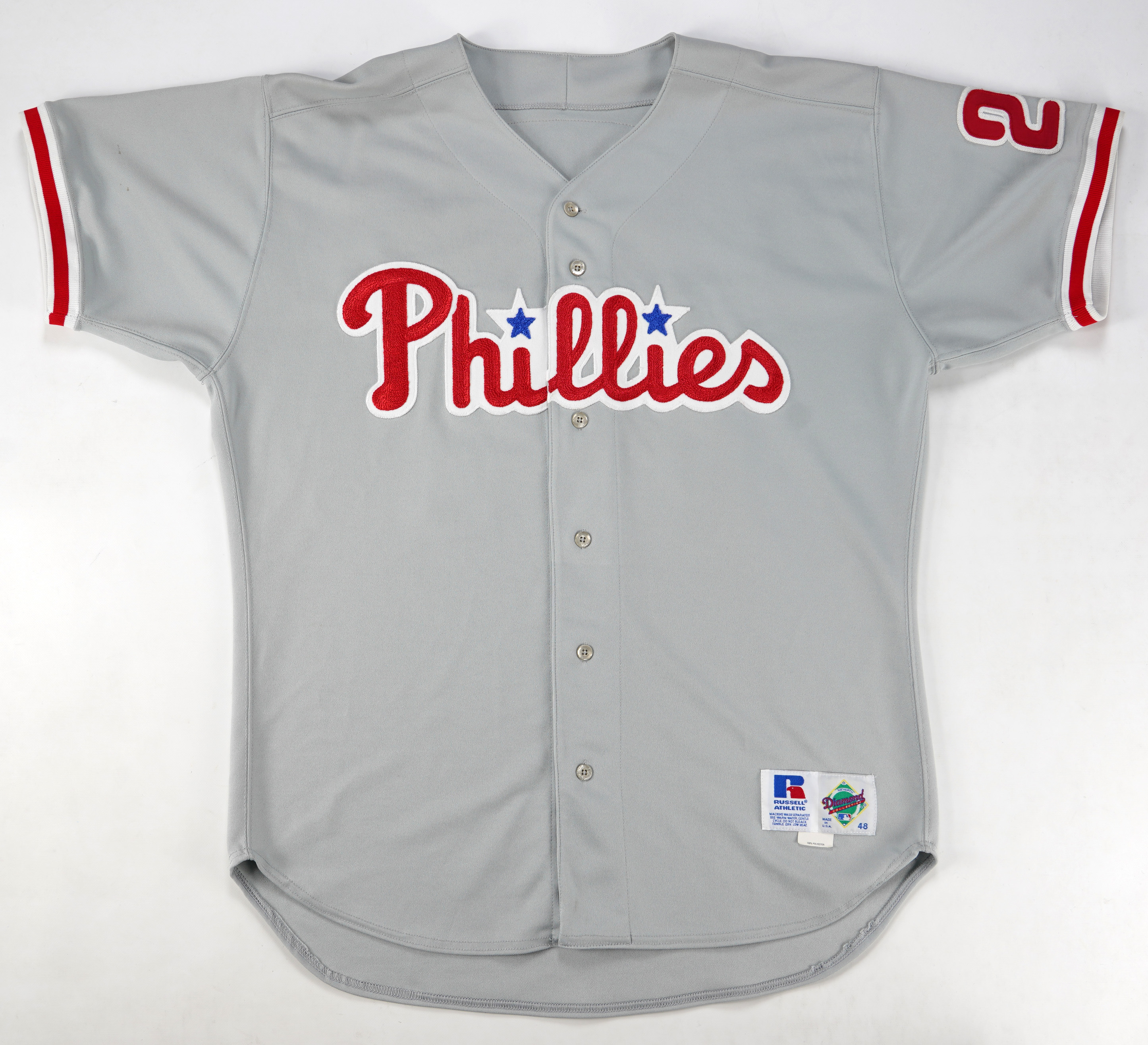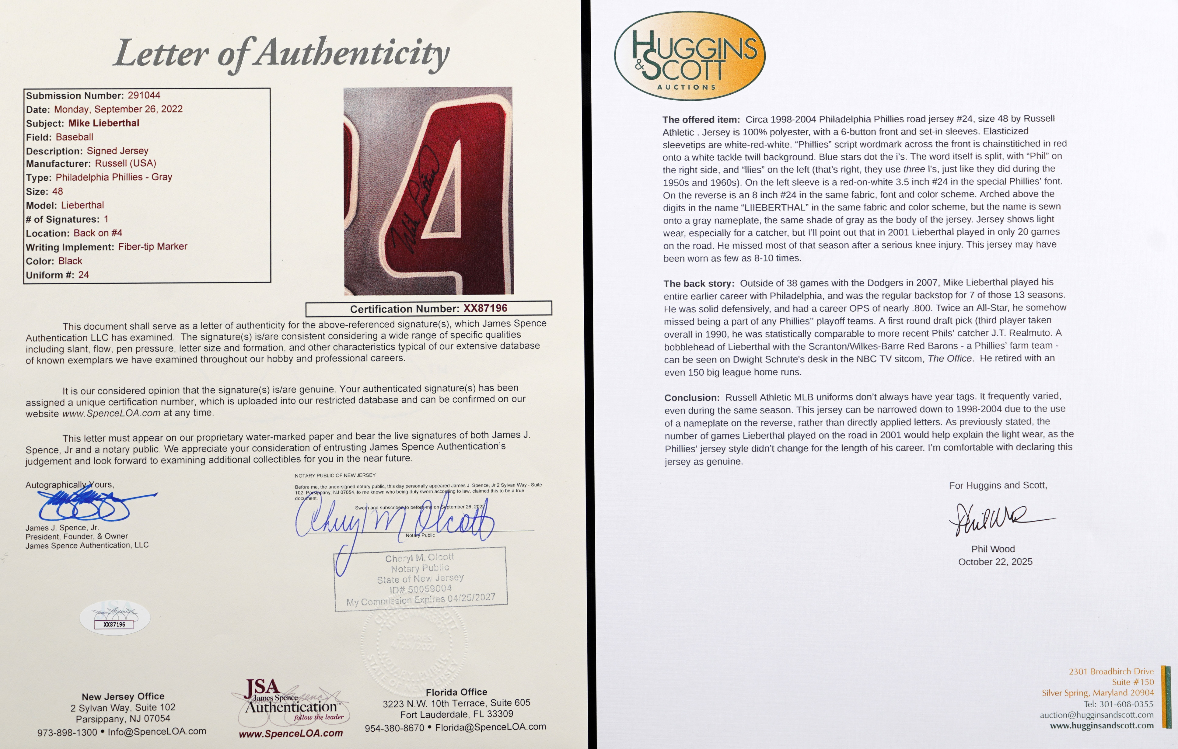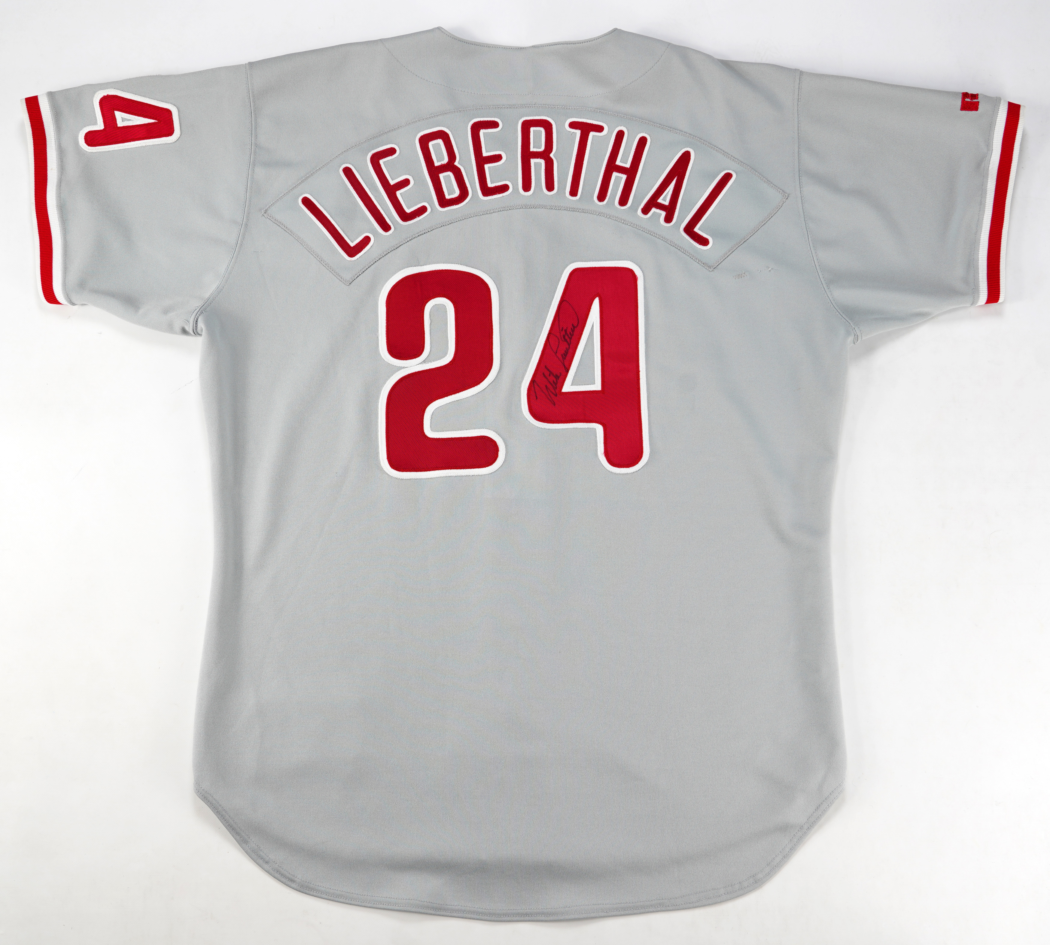 Game-used home jersey worn by longtime Phillies catcher Mike Lieberthal during the late 1990s and early 2000s. The presence of a nameplate on the reverse, rather than directly applied letters, dates this to 1998-2004 as outlined in the accompanying Phil Wood LOA. The jersey shows light wear, and Lieberthal has boldly signed the numeral on the reverse. An opportunity for collectors to own a signed, game-used piece from one of Philadelphia’s iconic catchers. Full LOA from James Spence/JSA for the signature. Phil Wood LOA.