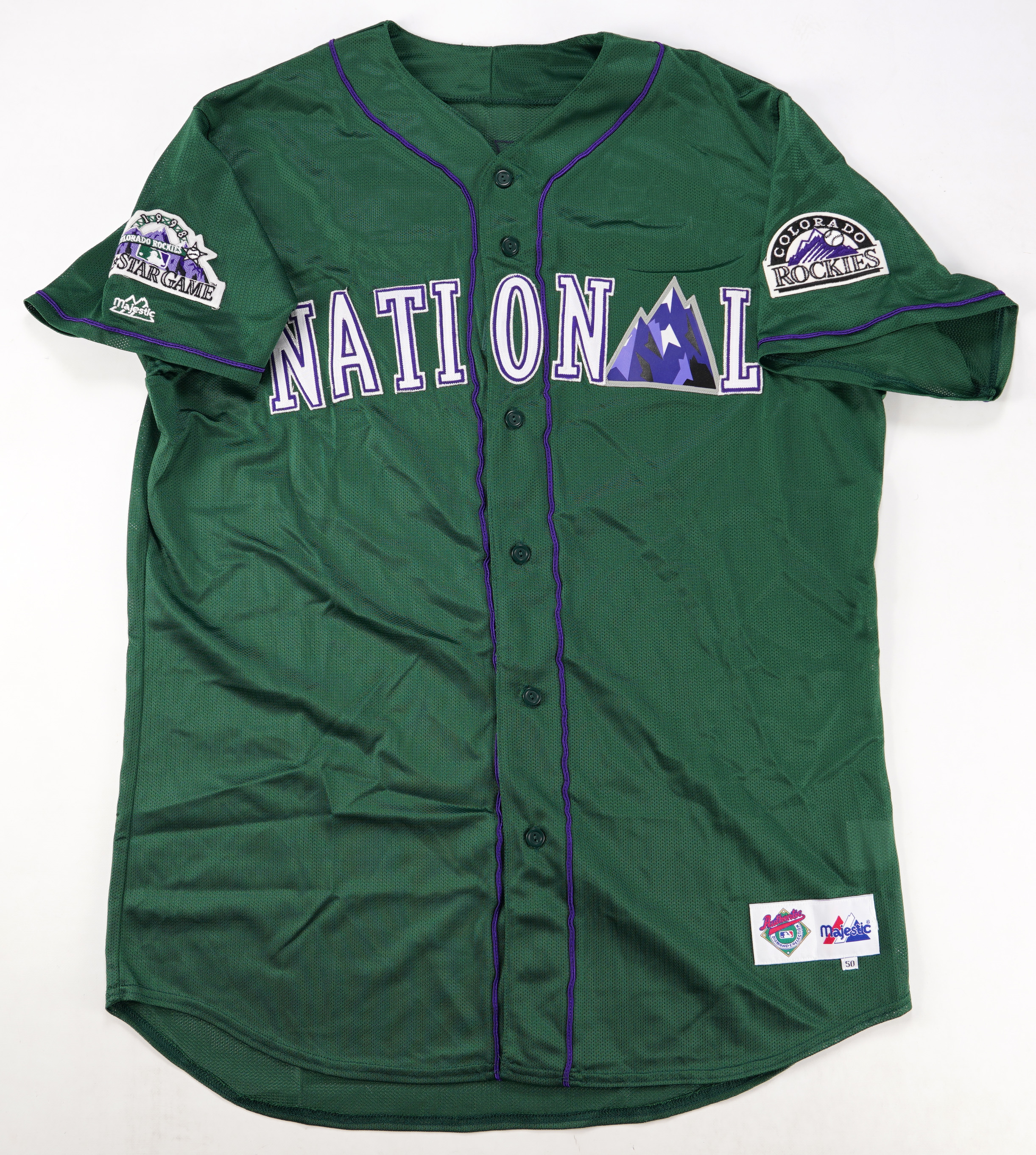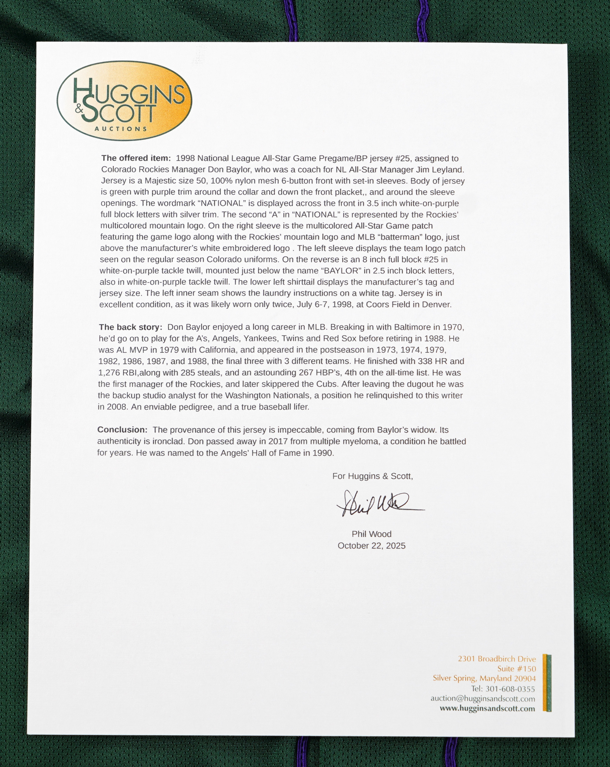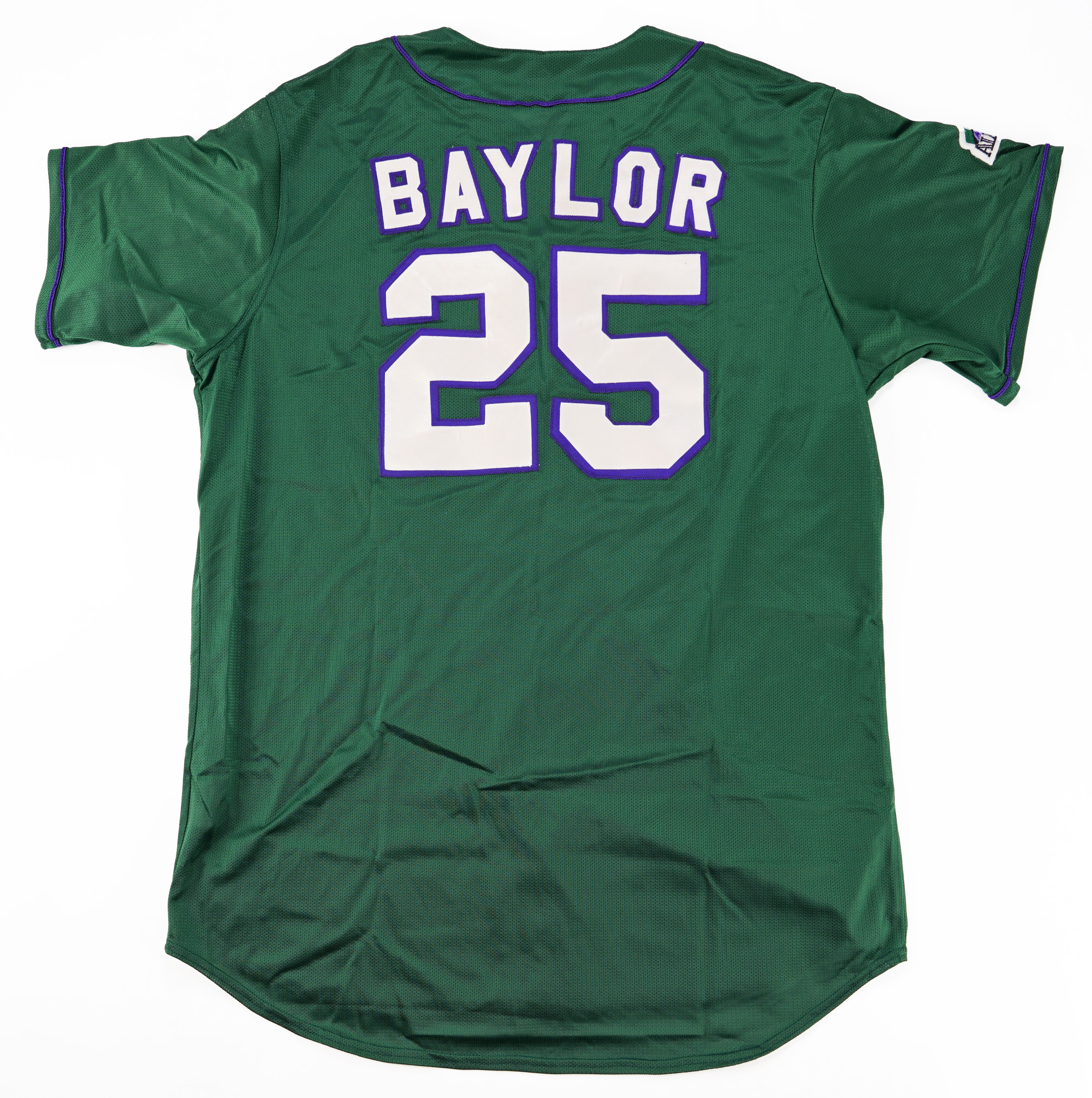 Outstanding batting practice/pregame jersey worn by 1998 National League All-Star coach Don Baylor, who joined the staff of manager Jim Leyland for the Midsummer Classic. Originating directly from Baylor's wife after his untimely passing, the green nylon mesh jersey bears "NATIONAL" across the front in white-on-purple full block letters with silver trim, with the second "A" represented by the Colorado Rockies' mountain logo (Baylor managed the Rockies during the season). The jersey remains in excellent condition, likely due to its short window of use during pregame festivities. Baylor was a perennial fan favorite, both as a player and a coach, making this is a desirable memento from his storied career. Accompanied by a letter of provenance from Becky Baylor, Don's wife, dated October 22, 2019, a Phil Wood LOA.