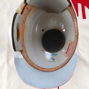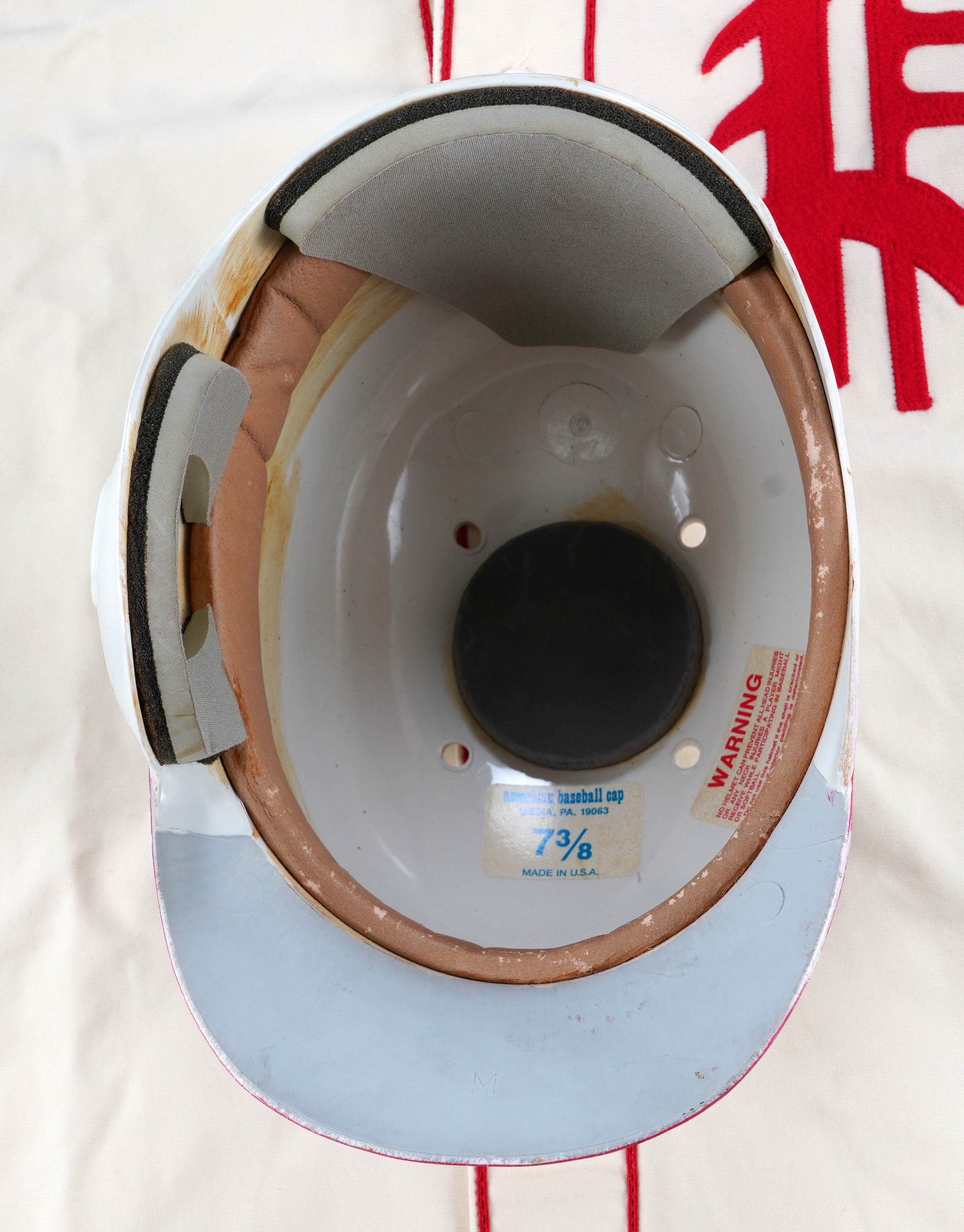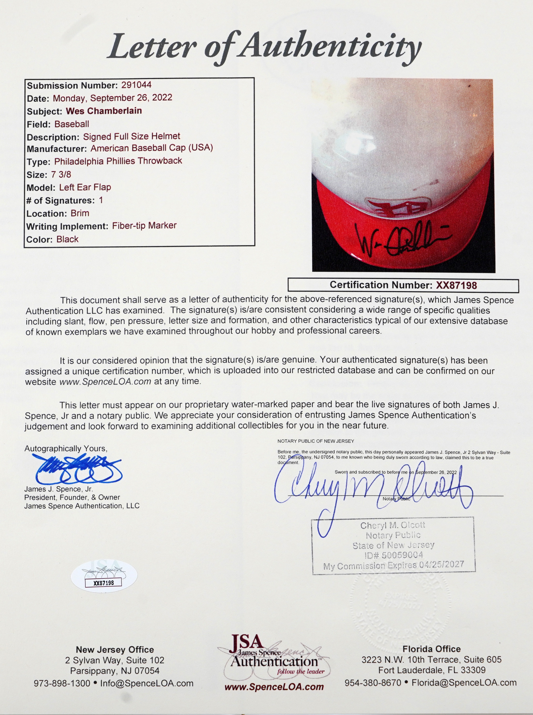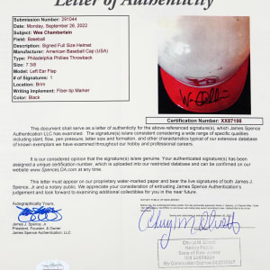 Wes Chamberlain Game-Used & Signed Batting Helmet: size 7-3/8 with left ear flap. Signed on the brim in black Sharpie (“9”, Full LOA from James Spence/JSA) and the helmet is uncracked and in excellent condition;