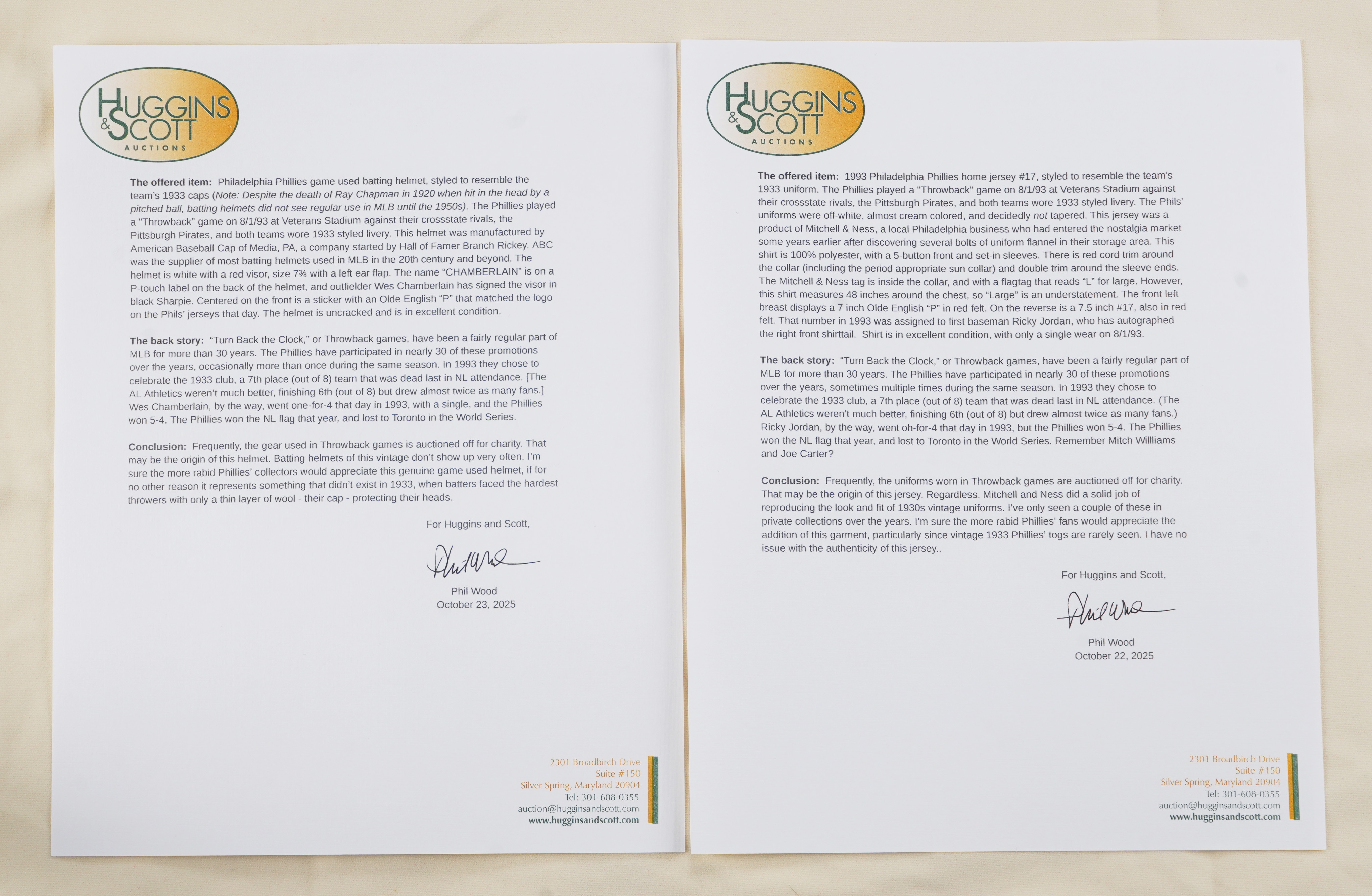 Each comes with a Full LOA from Phil Wood. Although the 1993 Philadelphia Phillies season culminated in heartbreak, the National League squad still earned top billing in the Senior Circuit. Offered is a pair of game-used items worn during the 8/1/93 “turn back the clock” contest against the Pittsburgh Pirates. These equipment pieces are each fashioned after the 1933 Phillies uniform. Includes: