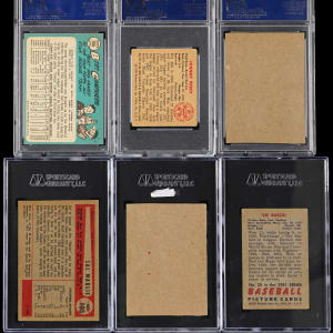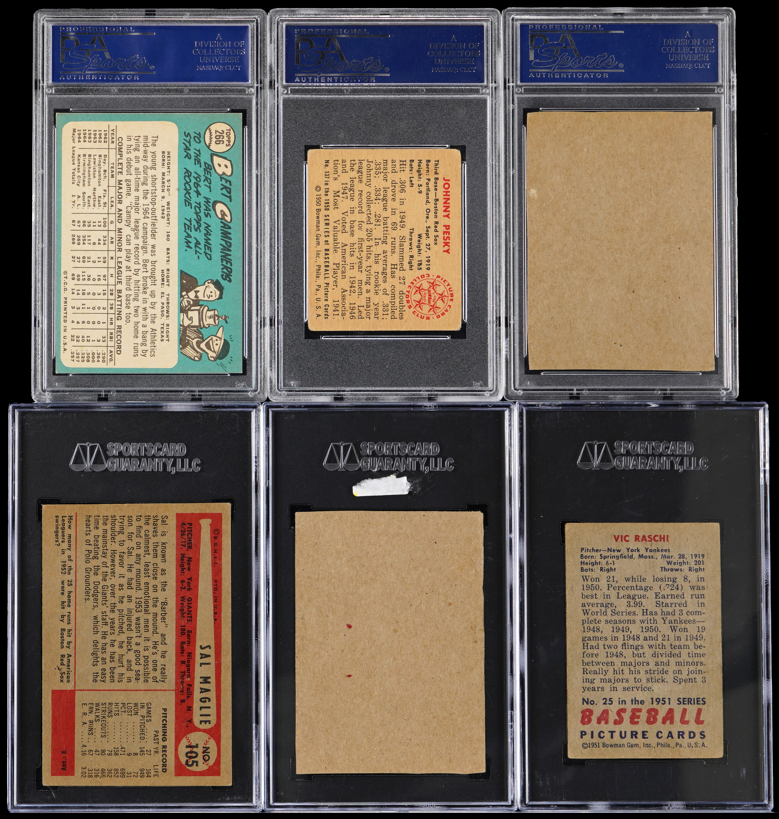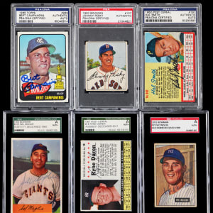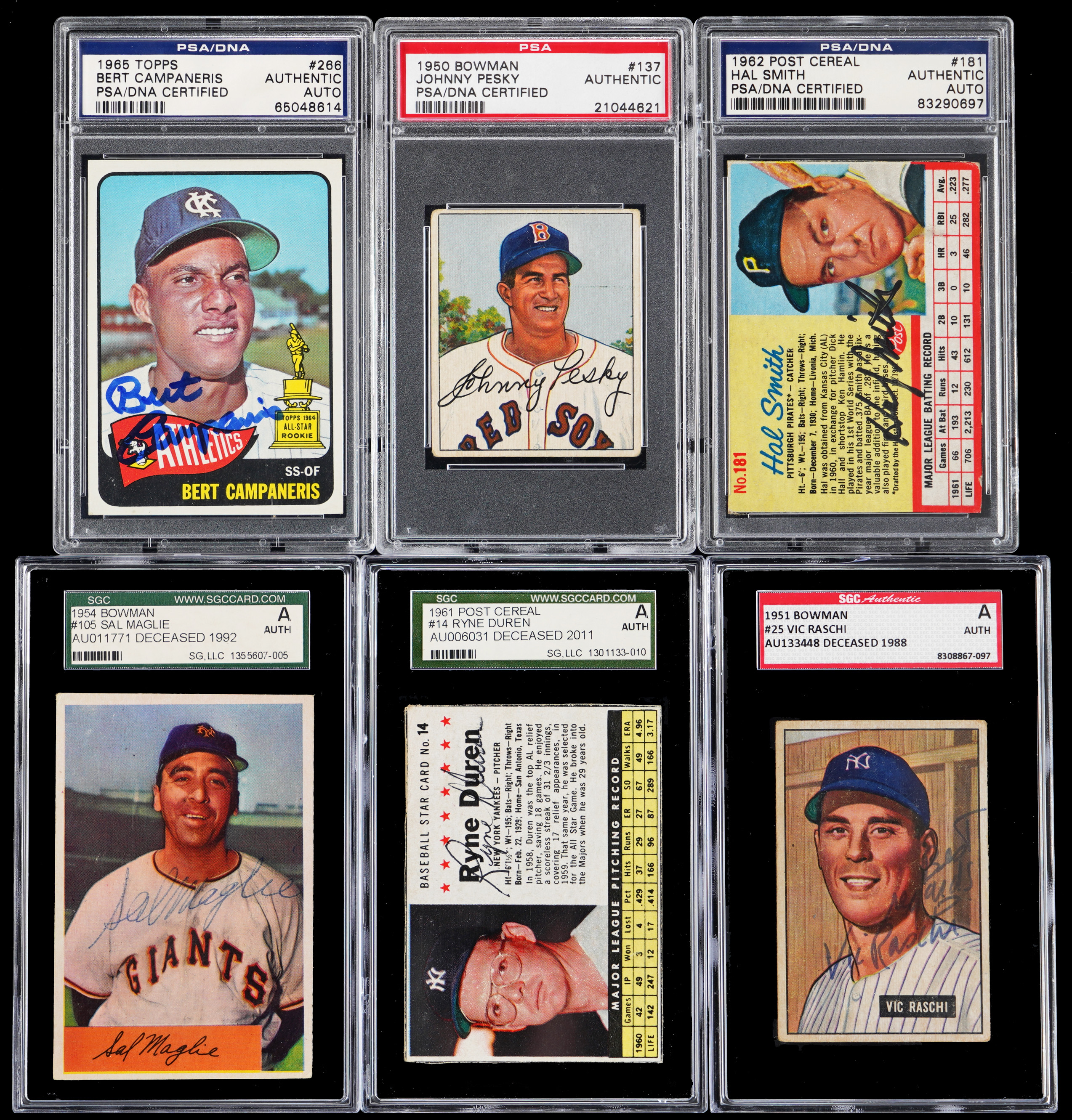 Each signature judged Authentic and encapsulated by either PSA/DNA, SGC/JSA or SGC Authentic. Grab some 'graphs with this six-pack of signed 1950-1965 baseball star cards. The average ("8") signatures are neatly placed on primarily (VG to EX) surfaces. Includes: PSA/DNA Authentic: (3 cards) with 1950 Bowman #137 Pesky, 1962 Post Cereal #181 H. Smith, 1965 Topps #266 Campaneris RC; SGC: (2 cards) with 1954 Bowman #105 Maglie, 1961 Post Cereal #14 Duren (box) and SGC Authentic: 1951 Bowman #25 Raschi.