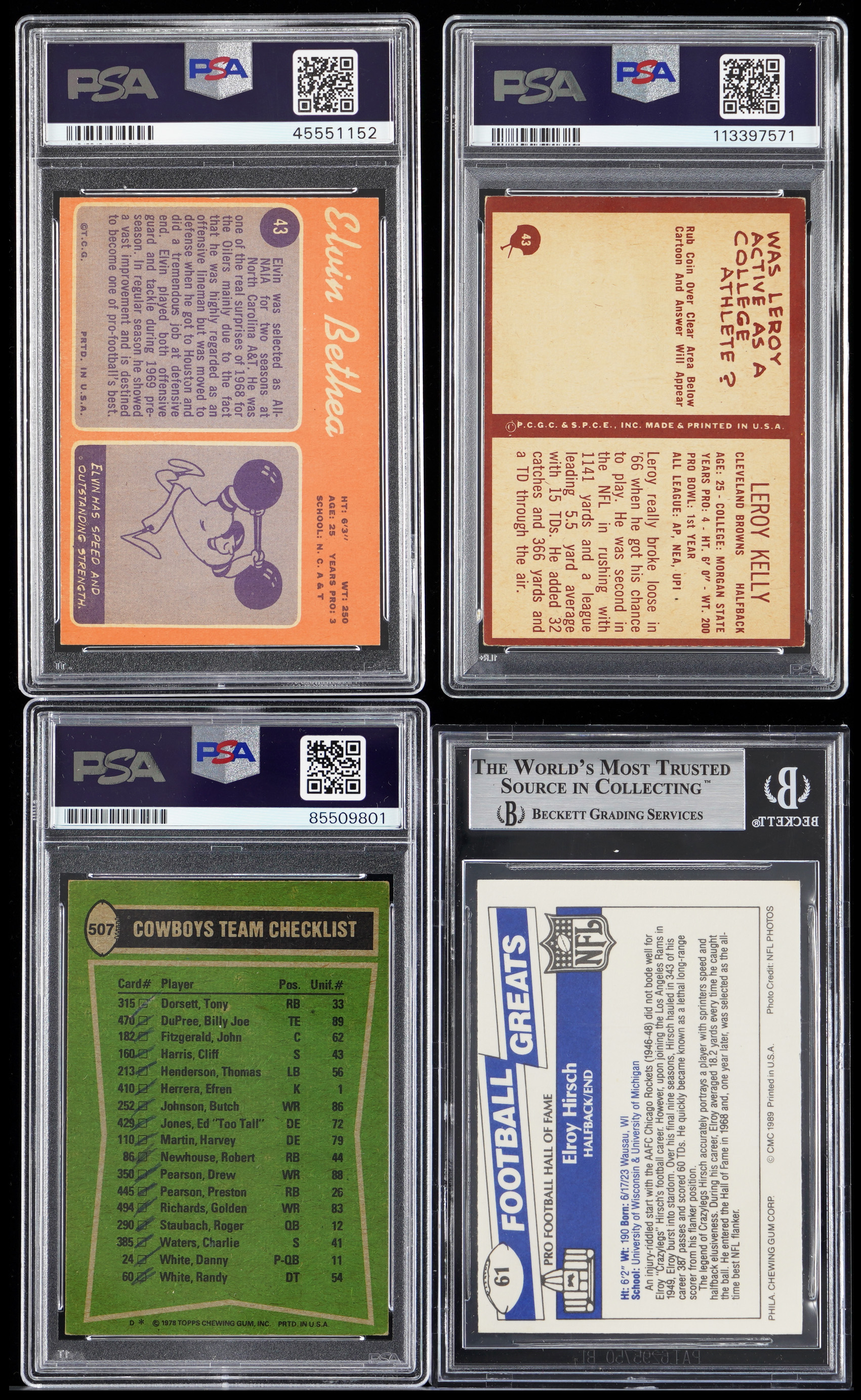 Each signature judged by PSA/DNA or Beckett Authentic and encapsulated. Reel in these four 1967-1989 Football Hall of Fame autographed cards. Includes: PSA/DNA Authentic: (3 cards) with 1967 Philadelphia #43 L. Kelly RC with four inscriptions (Auto 10, Card VG-EX 4), 1970 Topps #43 Bethea RC with inscription (card NM 7, auto presents "10"), 1978 Topps #507 Cowboys Leaders signed by Dorsett with inscription (Auto NM 7, card is marked) and Beckett Authentic: 1989 Swell Greats #61 Hirsch (Auto "8", card NM-MT).