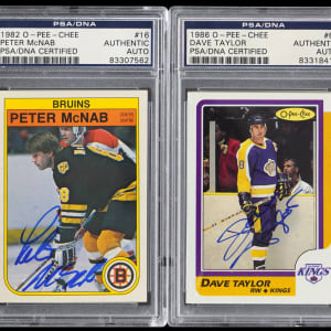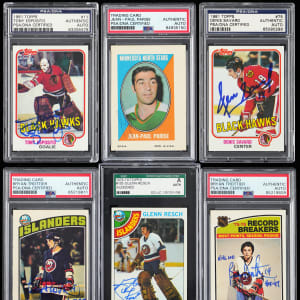 Each signature judged Authentic by PSA/DNA or SGC/JSA and encapsulated by the service. "Tickle the twine" with these (9) 1970-1992 Hockey Hall of Fame and star signed cards. Unless noted, the average ("9") autographs are neatly placed on primarily (NM) surfaces. Includes: PSA/DNA Authentic: (8 cards) with 1970-1971 Topps Sticker/Stamps Parise (light auto), 1976-1977 O-Pee-Chee: (2 cards) with #67 Trottier RB with two inscriptions, #115 Trottier RC with two inscriptions; 1981-1982 Topps: (2 cards) with #11 T. Esposito, #75 D. Savard RC; 1982-1983 O-Pee-Chee #16 McNab, 1986-1987 O-Pee-Chee #63 D. Taylor, 1991-1992 Score Canadian #135 Gartner and SGC: 1978-1979 Topps #105 Resch.