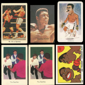 Two global superpowers in the The Beatles and Muhammad Ali (Cassius Clay) are true knockouts with these eight 1964-1979 foreign card singles. Includes: 1964 Dutch Gum Unnumbered Horizontal: (2) Cassius Clay with The Beatles (both GD); 1964 Dutch Gum Unnumbered Vertical: (2) Cassius Clay with The Beatles (VG, GD); 1969 Victoria Vedetten Parade: #583 Cassius Clay (PR, reverse paper loss); 1973 Panini OK VIP Italian: #182 Frazier vs. Clay (EX-MT); 1978 Swedish Samlarsaker: #46 Ali/Spinks (PR, reverse writing) and 1979 Venorlandus Our Heroes World of Sport: #2 Ali (NM).