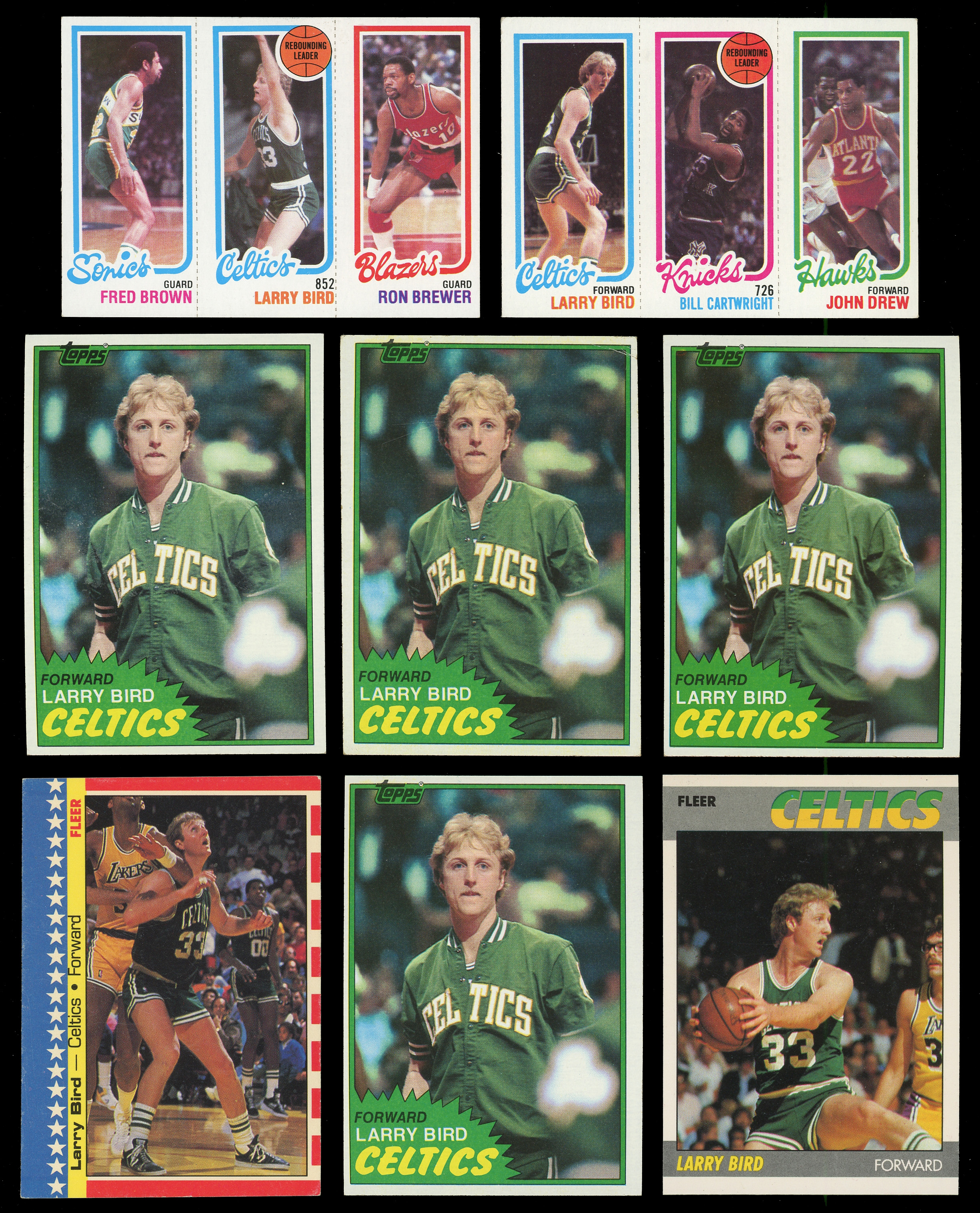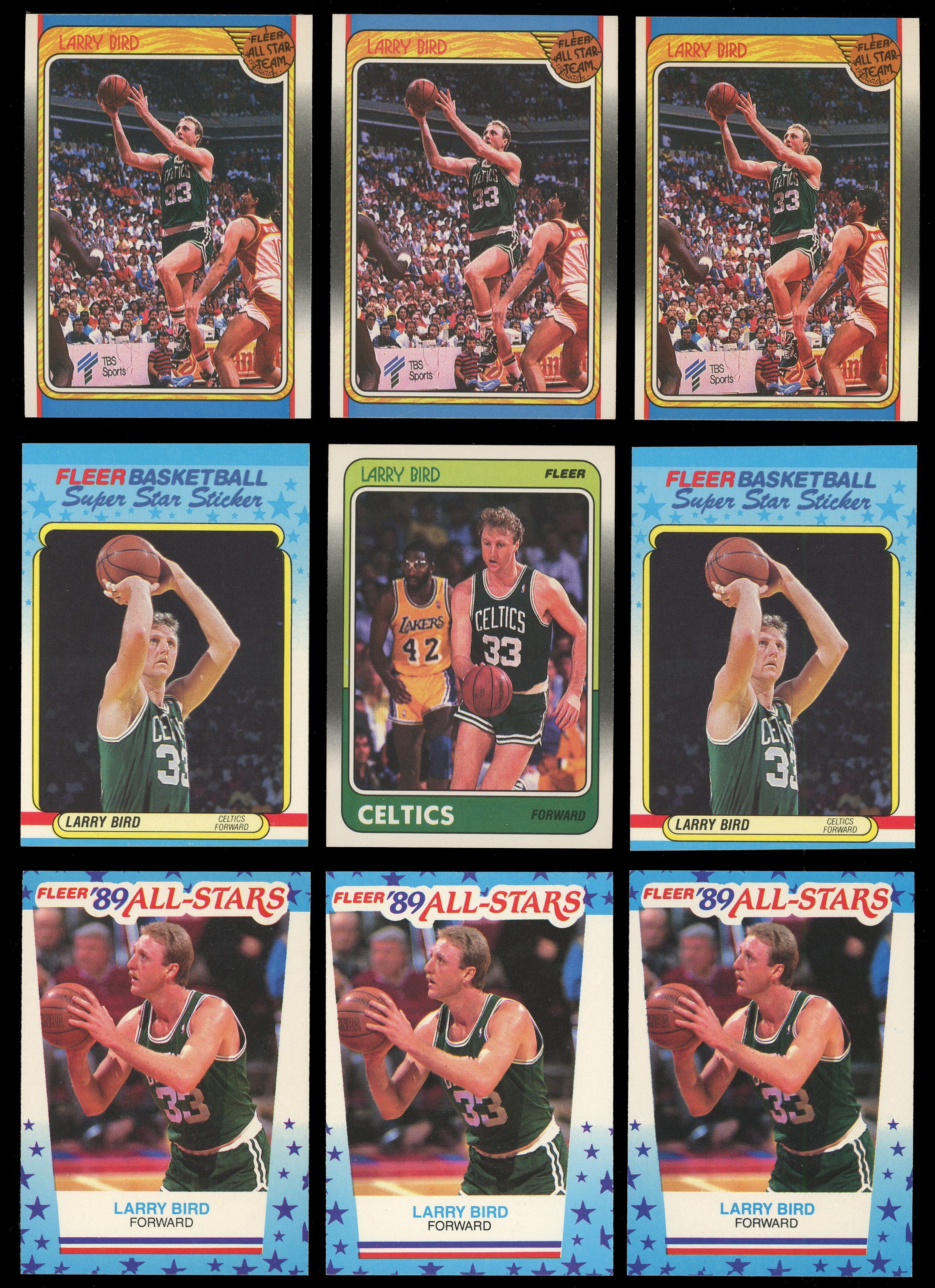 Boston Celtics Hall of Fame legend Larry Bird is king of the parquet with these (26) 1980-1990 Topps and Fleer Basketball singles. Includes: Topps Larry Bird: (11 cards) with 1980-1981 Topps: (2 cards) with #34 Bird RC/164/23 (EX), #228/#31 Bird LDR/198 (EX); 1981-1982 Topps: (9 cards) with (5) #4 (average EX), (2) #45 Celtics TL (NM, EX), (2) #101E SA (EX-MT, EX); Fleer Larry Bird: (15 cards) with 1986-1987 Fleer #9 (EX), 1987-1988 Fleer: (3 cards) with #11 (NM-MT), (2) #4 Sticker (EX-MT, EX); 1988-1989 Fleer: (7 cards) with (2) #9 (NM-MT, EX-MT), (3) #124 AS ((2) NM-MT, NM), (2) #2 Sticker (both EX-MT) and (4) 1989-1990 Fleer #10 Sticker (average NM).
