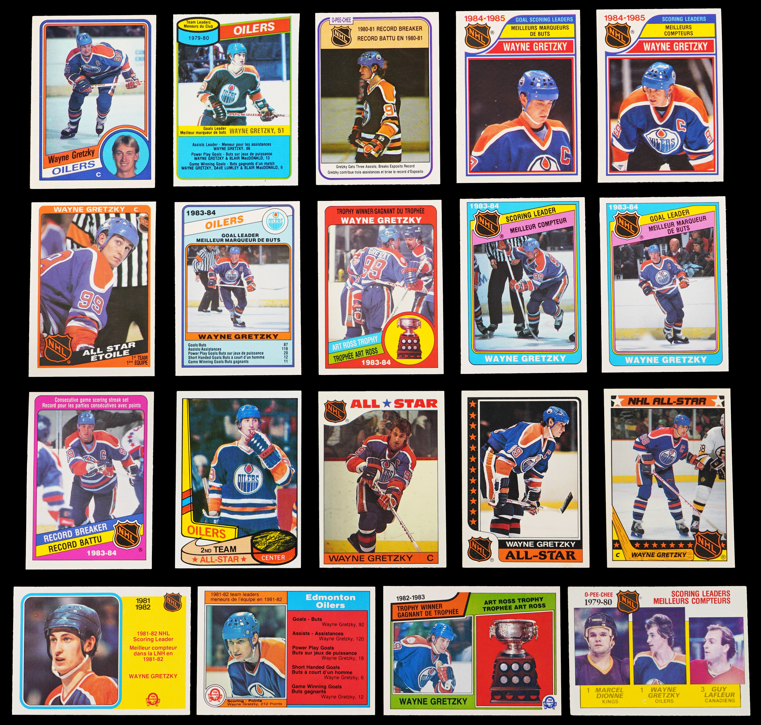 Seize greatness with the offered 1980-1988 Topps and O-Pee-Chee Wayne Gretzky collection of (70) cards. This high-grade compilation is highlighted by the following: Topps Gretzky: (20 cards, average NM to NM-MT) with 1980-1981 Topps: #87 AS (scratched), #182 Oilers TL (scratched), (3) #250 (one EX-MT is unscratched, (2) scratched); (3) 1981-1982 Topps #16 (NM, EX-MT, EX), 1984-1985 Topps #51 (NM-MT), 1985-1986 Topps #120 (EX-MT); O-Pee-Chee Gretzky: (50 cards, average NM to NM-MT) with 1981-1982 O-Pee-Chee #182 TL (EX-MT), (2) 1982-1983 O-Pee-Chee #106 (both EX-MT), 1984-1985 O-Pee-Chee #243 (EX) and (2) 1987-1988 O-Pee-Chee #53 (NM-MT, EX-MT).