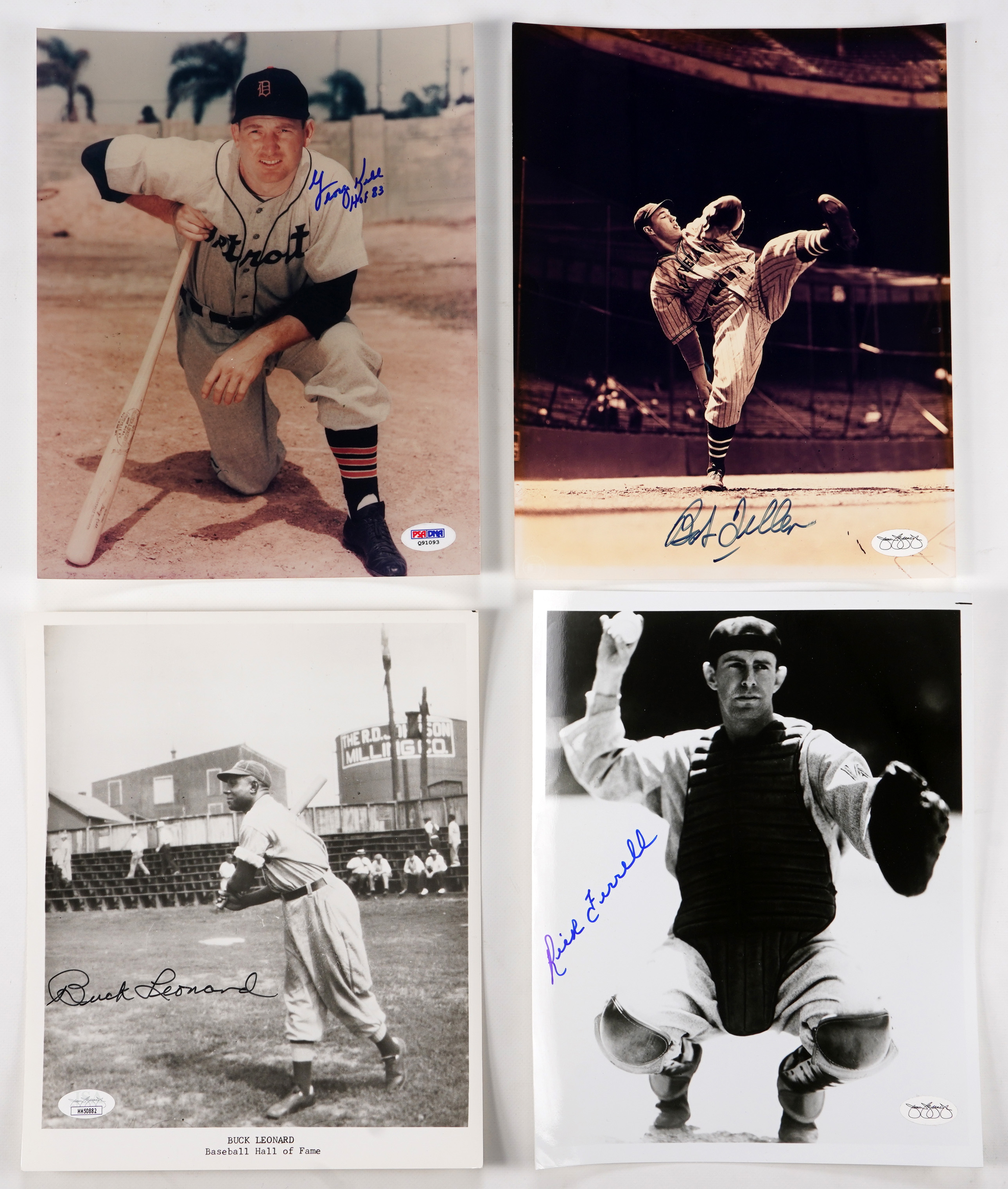 Sweet sixteen of signed Hall of Fame 8x10 photographs. Each average "9" autographed picture is individually certified and comes with a cert card (unless noted). Includes: Beckett: Dickey; JSA Stickers: (6 photos) with Boudreau (no cert card), Feller (no cert card), R. Ferrell (no cert card), Leonard, Minoso, Stargell (no cert card); PSA/DNA Stickers: (8 photos) with Boudreau/Kell (tear, no cert card), Dandridge, Durocher, B. Harris (d.1977), Hunter, Kaline (no cert card), Kell (HOF 83), G. Kelly and SGC: Coveleski (no cert card).