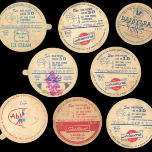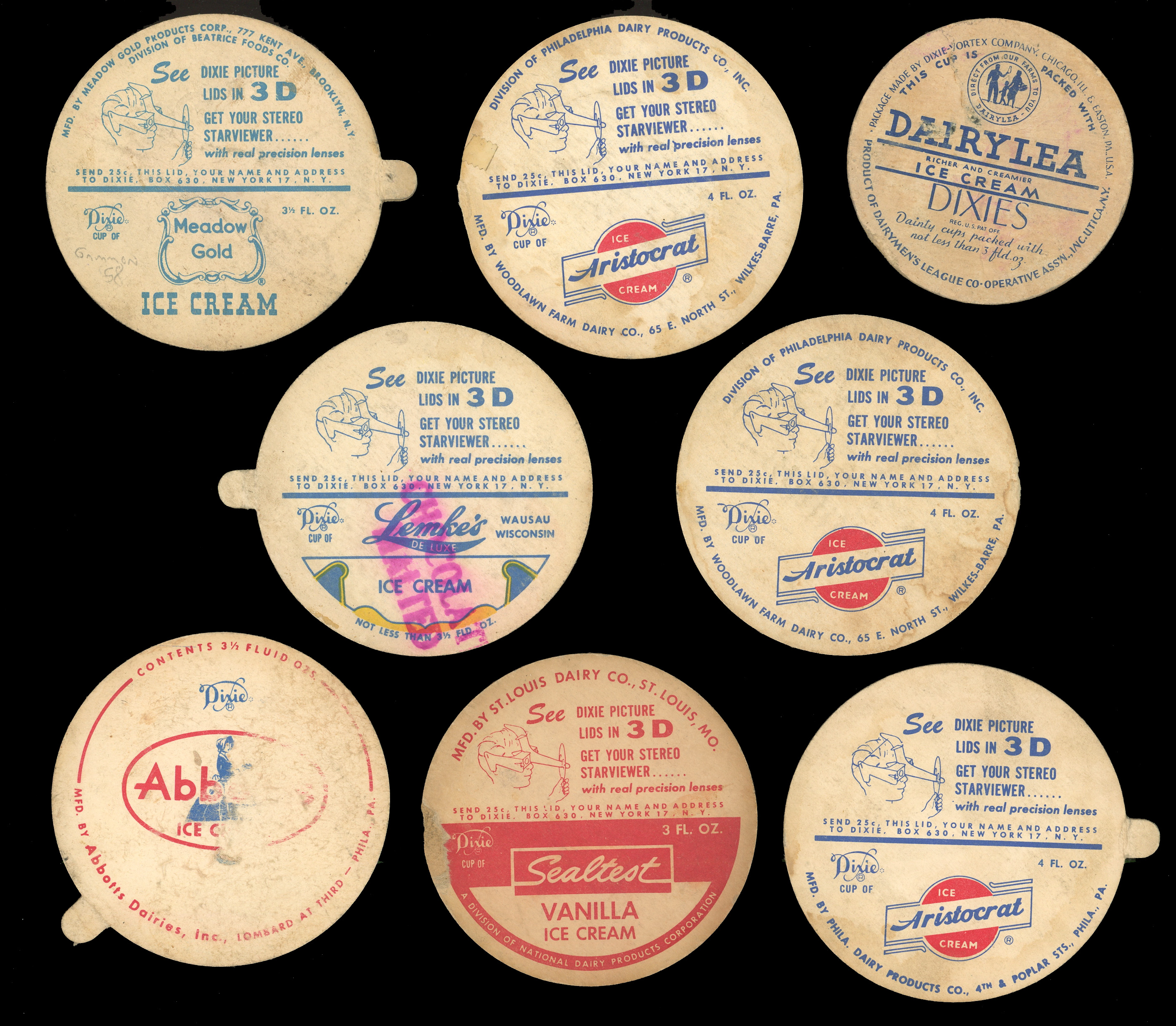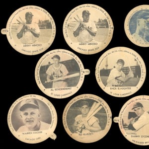 Churn several Hall of Famers and stars with these eight 1938-1954 Dixie Lids. Includes: 1938 Dixie Lids: Feller (PR, paper loss, no tab); 1953 Dixie Lids: Hacker (PR, reverse paper loss, no tab); 1954 Dixie Lids: (6 lids) with Kluszewski (PR, paper loss, no tab), (2) Minoso (one GD, stain, with tab, one FR, reverse tape, no tab), O'Connell (VG, stain, with tab), Schoendienst (GD, with tab, reverse stamp) and Slaughter (VG, no tab).