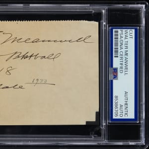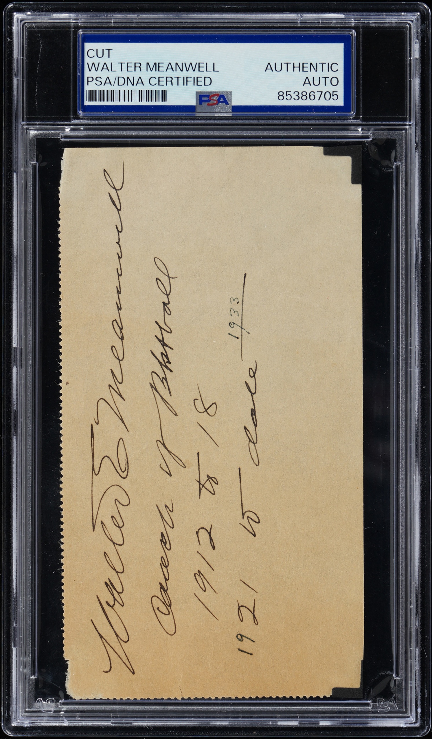 1959 Basketball Hall of Famer! Signature judged Authentic by PSA/DNA and encapsulated by the service. Early national championship coach Walter Meanwell (d.1953) penned the offered cut. In addition to his full initialed name, the Wisconsin Badgers innovator added "Coach of Bskball - 1912 to 18 - 1921 to date" as inscriptions. A 1933 notation is placed to the right of the solid "9" endorsement. Being that Meanwell retired from coaching in 1934, this is a later, but still exceptionally scarce autograph!