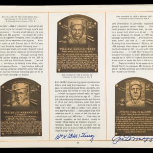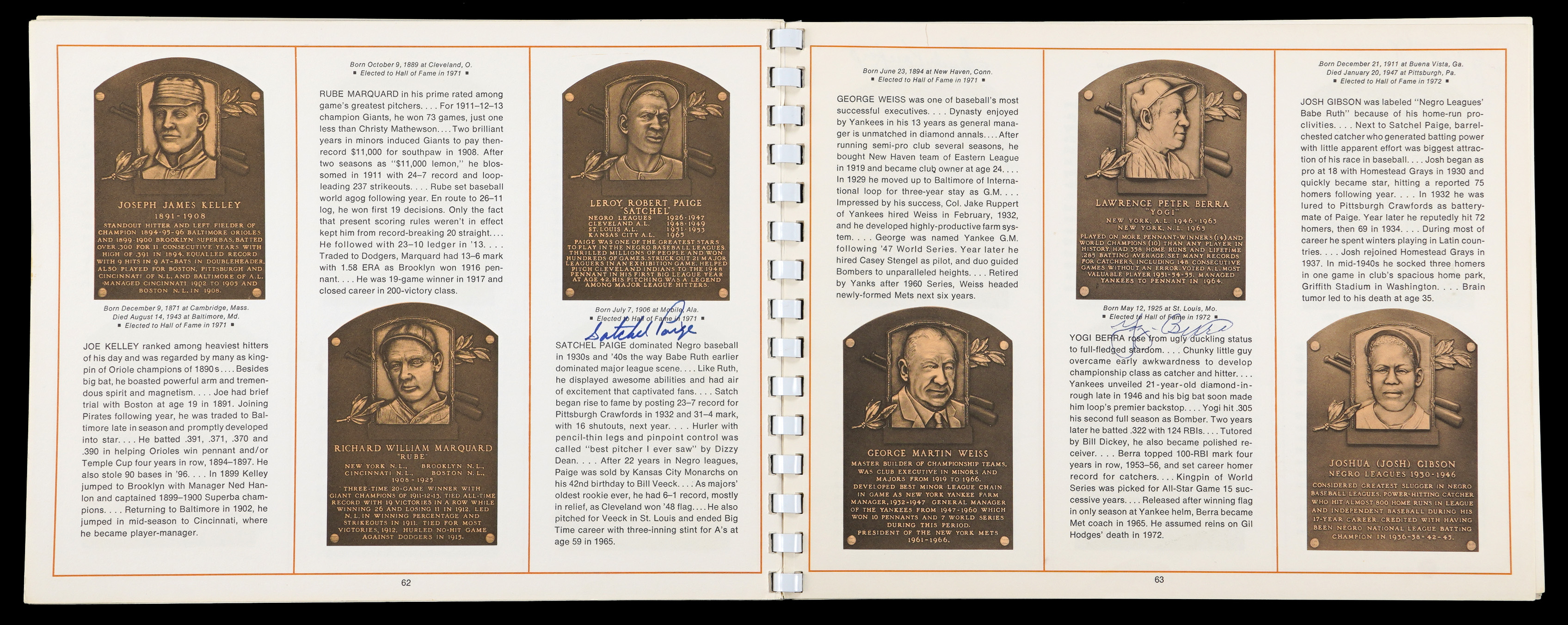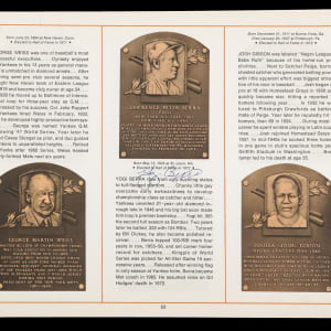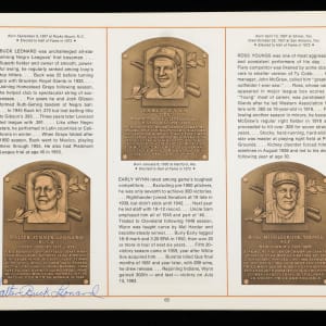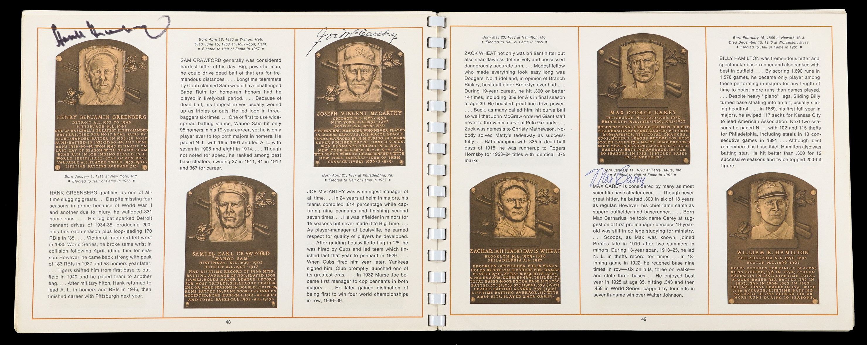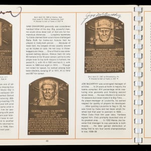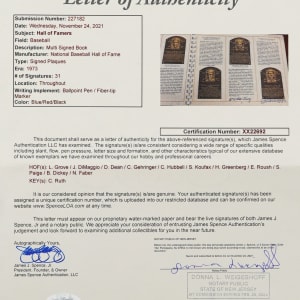 On August 6, 1973, six legends were inducted into the National Baseball Hall of Fame. It was a banner occasion as a host of diamond royalty reunited in upstate New York that summer afternoon. The offered 1973 National Baseball Hall of Fame and Museum program crossed paths with (34) permanent Cooperstown residents. This spiral bound publication was penned in black, blue and red ink across two dozen different pages with the autographs averaging ("9") strength. Signatories include: Berra, Boudreau, Carey, Coveleski, Cronin, Dean, DiMaggio, Faber, Feller, Frick, Gehringer, Gomez, Greenberg, Grimes, Grove, Haines, Hoyt, Hubbell, Irvin, G. Kelly, Koufax, Leonard, Lyons, (2) J. McCarthy, Medwick, Musial, Paige, Roush, Ruffing, Mrs. Babe Ruth, Spahn, Terry and L. Waner. Full LOA from James Spence/JSA.
