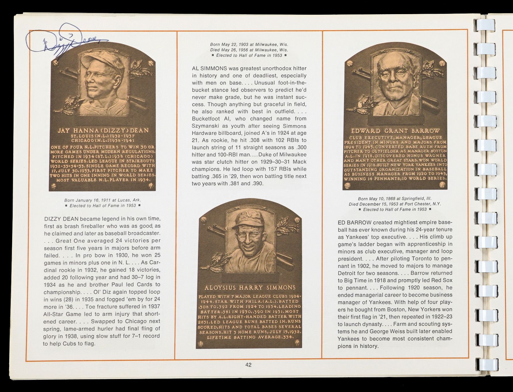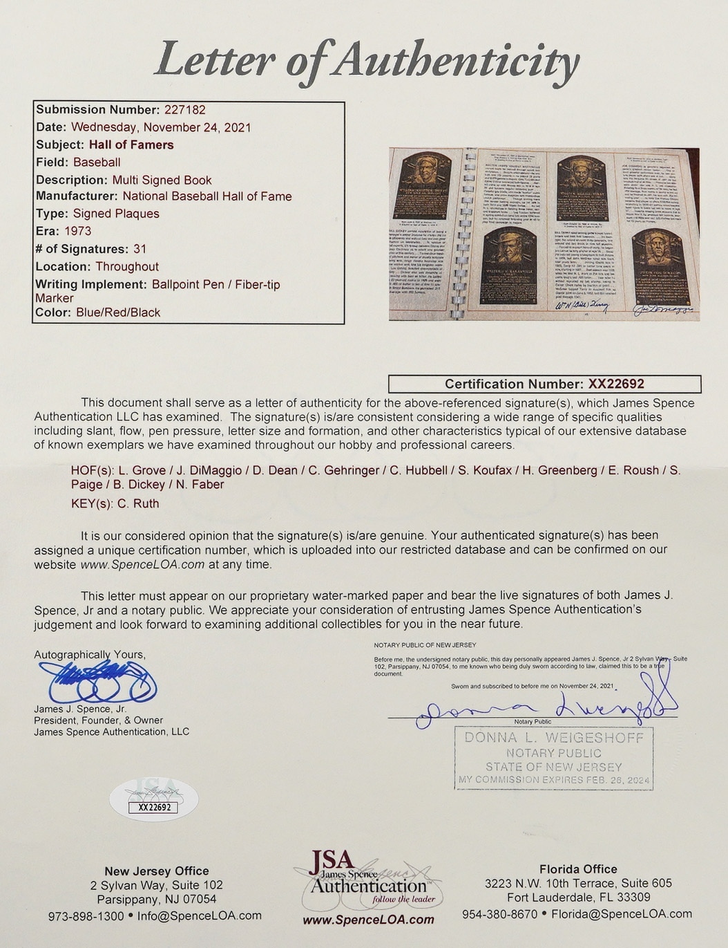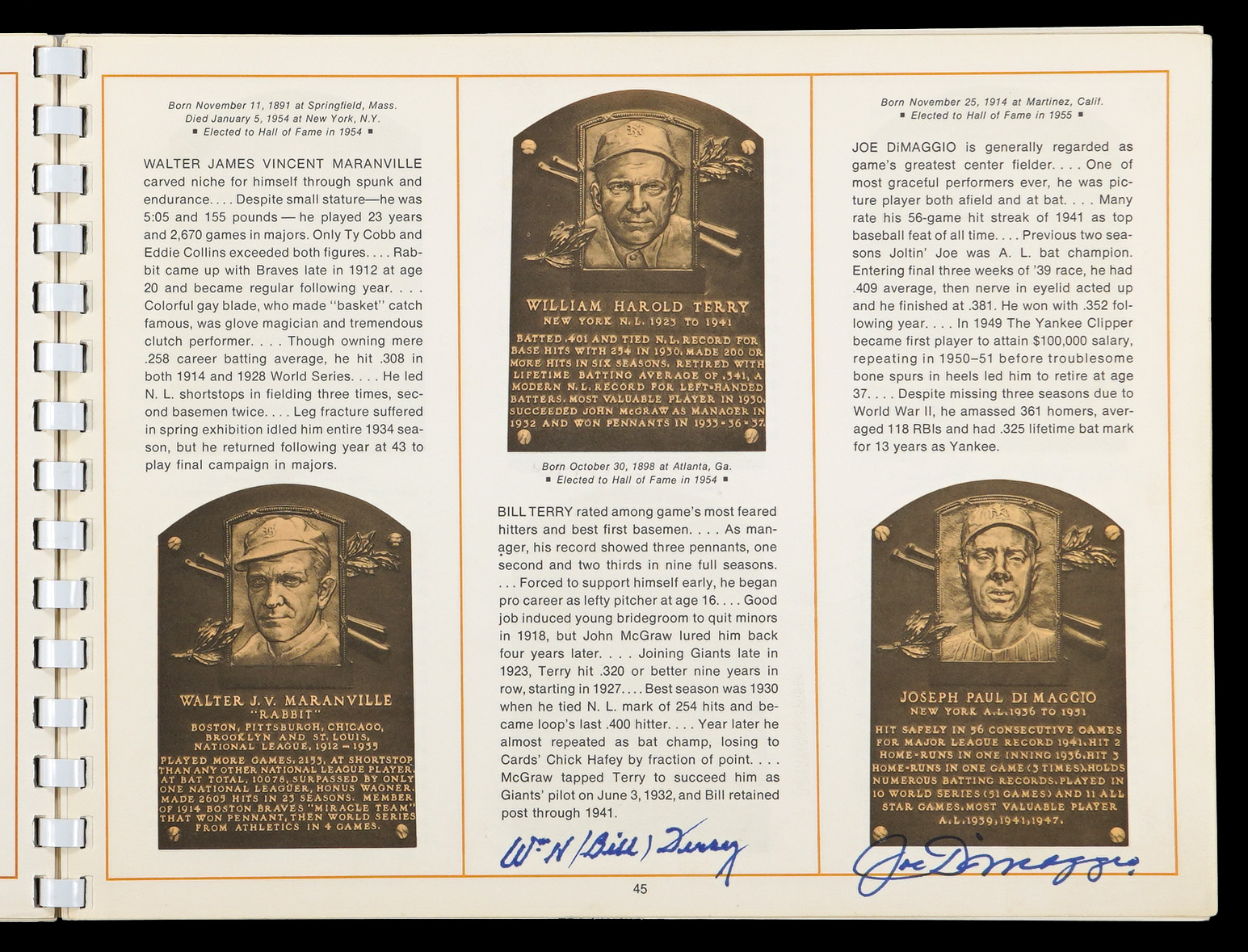 On August 6, 1973, six legends were inducted into the National Baseball Hall of Fame. It was a banner occasion as a host of diamond royalty reunited in upstate New York that summer afternoon. The offered 1973 National Baseball Hall of Fame and Museum program crossed paths with (34) permanent Cooperstown residents. This spiral bound publication was penned in black, blue and red ink across two dozen different pages with the autographs averaging ("9") strength. Signatories include: Berra, Boudreau, Carey, Coveleski, Cronin, Dean, DiMaggio, Faber, Feller, Frick, Gehringer, Gomez, Greenberg, Grimes, Grove, Haines, Hoyt, Hubbell, Irvin, G. Kelly, Koufax, Leonard, Lyons, (2) J. McCarthy, Medwick, Musial, Paige, Roush, Ruffing, Mrs. Babe Ruth, Spahn, Terry and L. Waner. Full LOA from James Spence/JSA.
