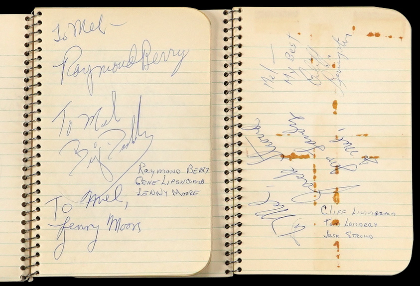 Recall the “Greatest Game Ever Played” with this pair of 1958 football autograph books. On 12/28/58, the Baltimore Colts and the New York Giants took the field at Yankee Stadium to battle it out in the NFL Championship Game. After four hard-fought quarters, the combatants stood tied at a score of 17-17. A dramatic overtime period ensued, and with 6:45 remaining on the clock, Baltimore fullback Alan Ameche gained the bit of real estate the Colts would, scoring the winning touchdown on a 1-yard rush. This nationally televised game changed the course of NFL history. Prior to this broadcast, the college game ruled the land, and football historians point to this “Great Game Ever Played” as the contest that opened the door to a rapid rise in popularity for the professional league.