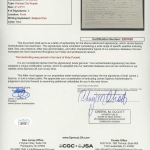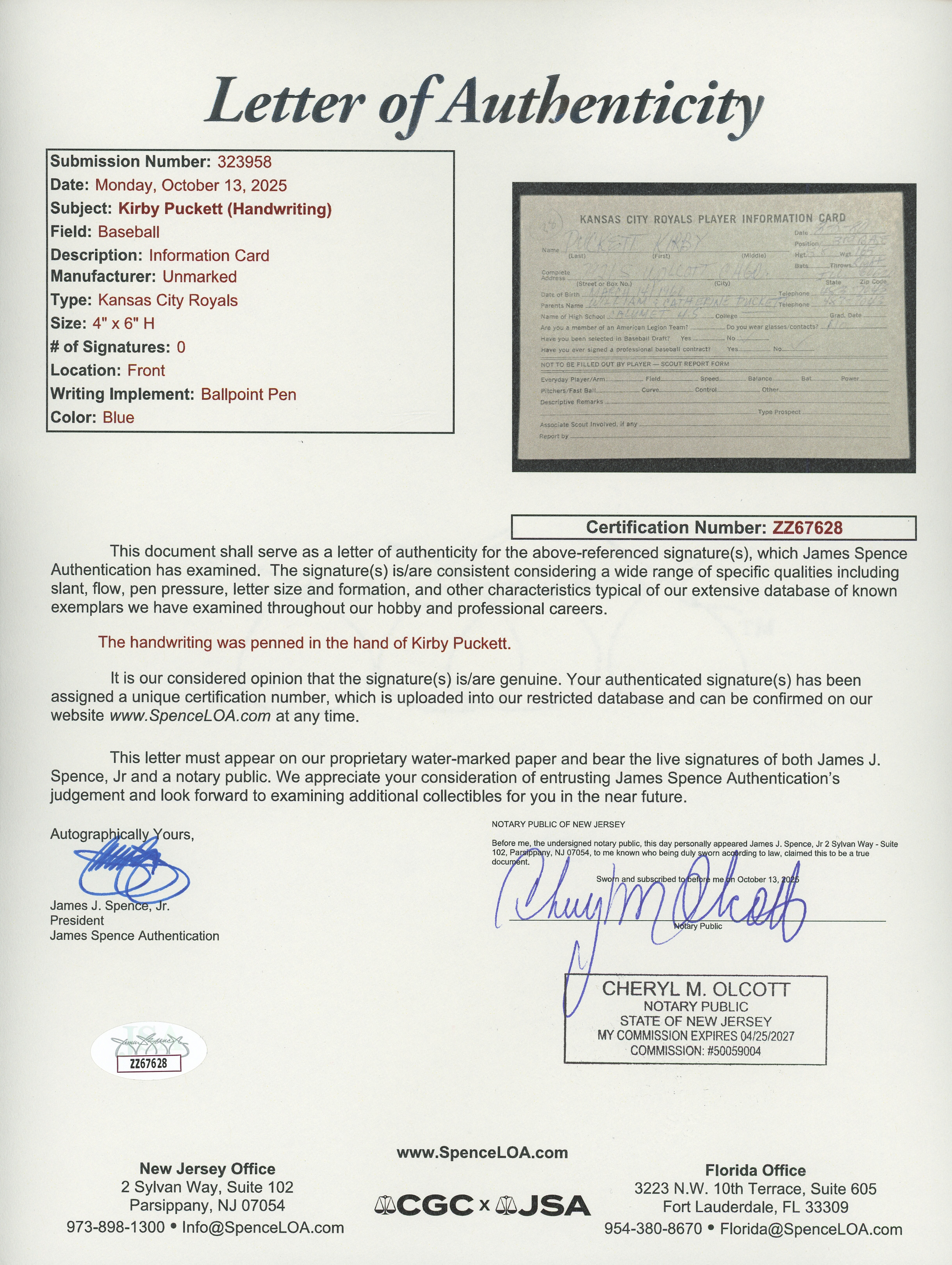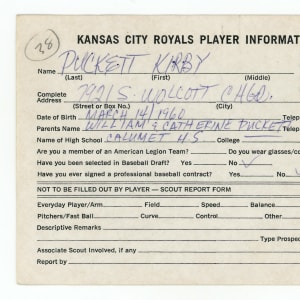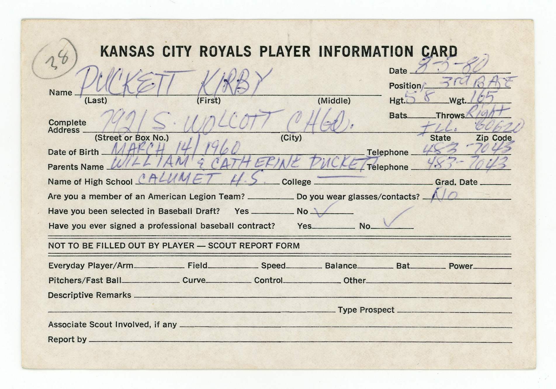 Earliest Known Kirby Puckett Baseball Related Signature! Incredible one-of-a-kind 1980 Kirby Puckett handwritten signature placed on a Kansas City Royals Player Information Card. From the estate of longtime MLB and Kansas City scout Art Stewart, this dated 8-6-80 tryout card measures 5-7/8 x 4" and is penned by the future Minnesota Twins Hall of Famer in blue ink with complete details regarding Puckett's address, contact/family information, height/weight and desired position (3rd base!). Most interesting is that Puckett checked "No" regarding questions if he had ever been drafted or signed a professional baseball contract. Kansas City didn't sign him. Per Wikipedia: "An All-American baseball player at Calumet High School, Puckett received little attention from baseball scouts, and he took a job installing carpeting in new cars for the Ford Motor Company. After being laid off by Ford, Puckett attended an open tryout hosted by the Kansas City Royals of Major League Baseball (MLB), where he received a college baseball scholarship from Bradley University." Suffering from a lack of playing time at Bradley, Puckett transferred to Junior College Triton (Illinois), caught the eye of the Minnesota Twins assistant farm director...and the rest is history! A museum worthy piece that will serve as the foundation of any advanced Kirby Puckett collection. Full LOA from James Spence/JSA.