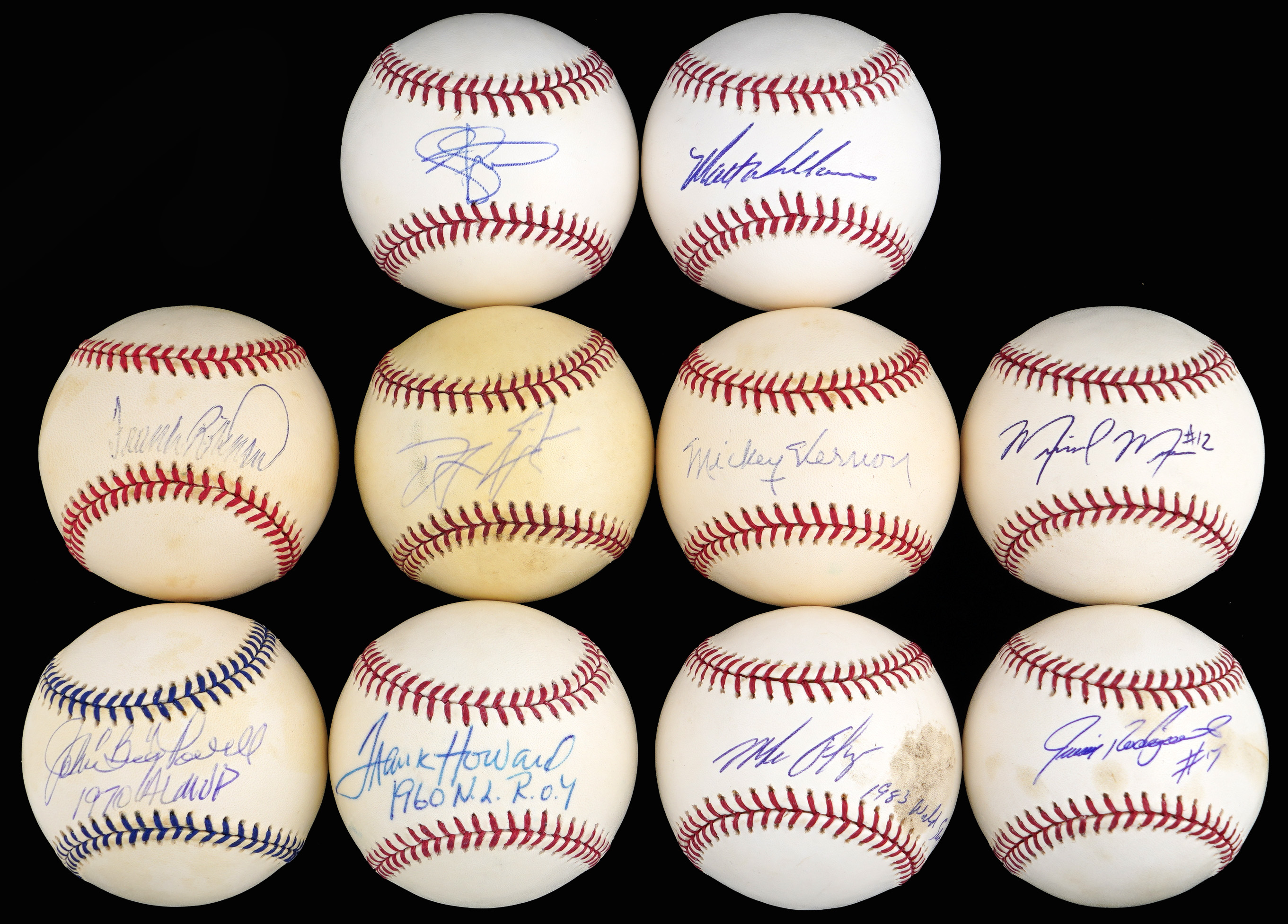 These (16) single-signed balls include many of the most popular players in the Baltimore/Washington area. They average creamy to white. Signatures average (“8 to 9”).