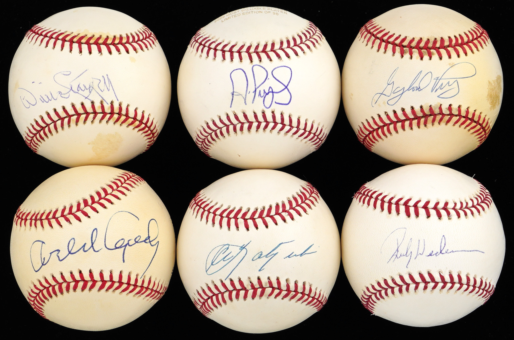 Hall of Famer and star collection of seventeen single-signed baseballs, highlighted by Albert Pujols, Carl Yastrzemski, Rickey Henderson. Unless otherwise noted, all the signatures appear on the sweet spot of an official American, Major, or National League baseball dating from the 1980s or later. Most of the balls have varying degrees of age toning, otherwise all are in Excellent to Mint or better condition overall. This collection consists of the following: Burke (Negro Leagues commemorative "Ernest Burke" baseball), Burnett ("2003 World Champs" inscription), Cepeda (HOF), Colavito, D. DiMaggio, Feller (HOF), Groat, Heinrich (PSA/DNA GEM MINT 10 signature), Henderson (HOF), McCovey (PSA/DNA MINT 9 signature), Oliver, Perry (HOF), Pujols (Official Major League "Albert Pujols" limited-edition baseball), Stargell (HOF), Trucks (signed "Virgil Fire Trucks"), Uecker, and Yastrzemski (HOF). Auction LOA from James Spence/JSA. The size/weight of this item requires that there will be an additional shipping charge for this lot. Total: 17 signed baseballs.