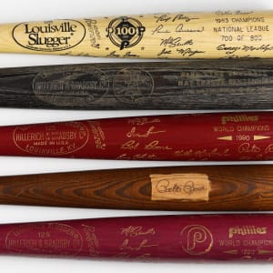 Also present is a period 4x6 photograph of Pete Rose taking a playful break from a signing session of hundreds of bats in the Phillies locker room.