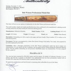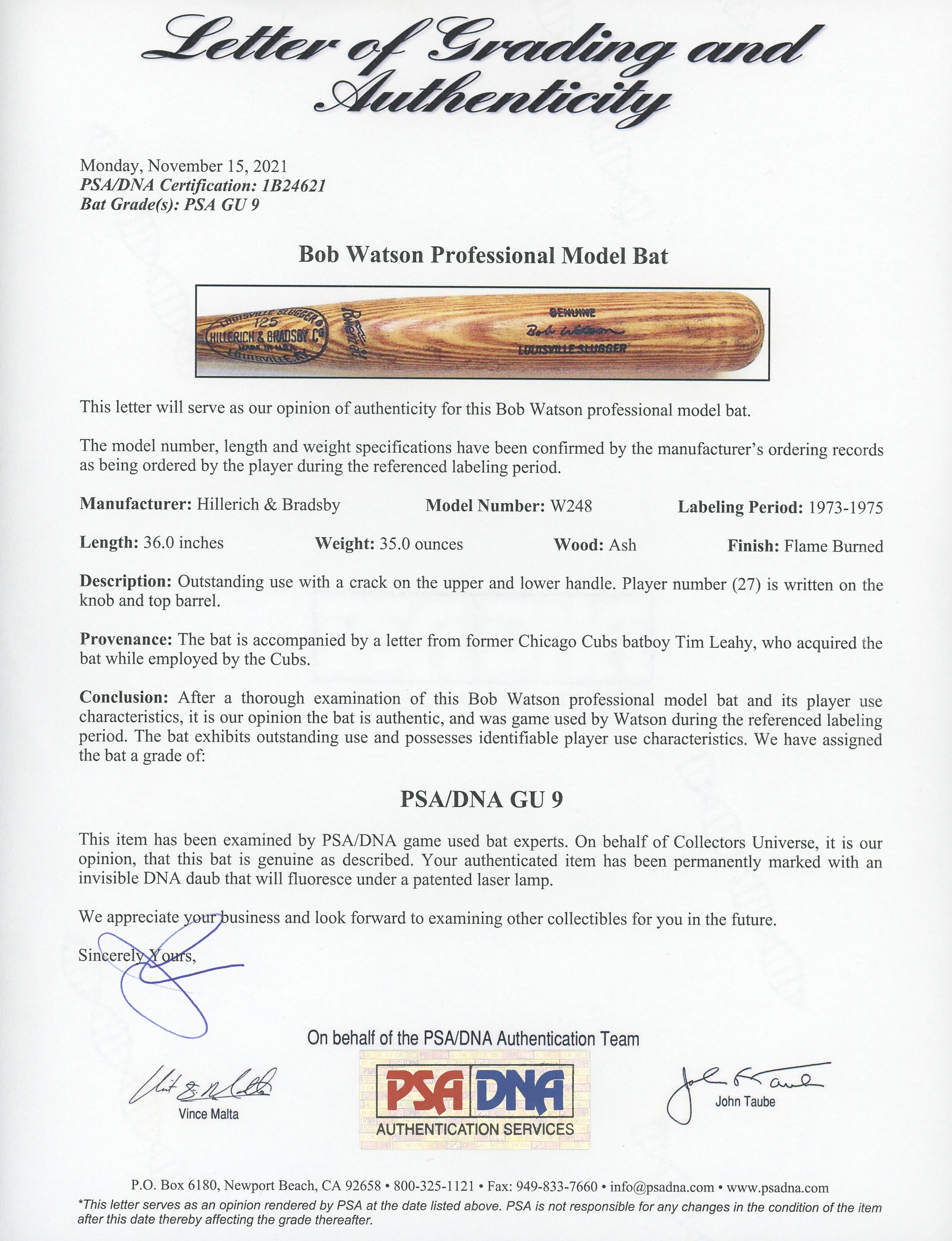 1973-1975 Bob Watson Professional Model Bat: 36.0 inches/35.0 ounces Hillerich & Bradsby Model W248 with outstanding use with a crack on the upper and lower handle. Uniform 27 is written on the knob and barrel. Stated provenance letter is not included – PSA/DNA GU 9;