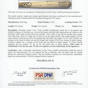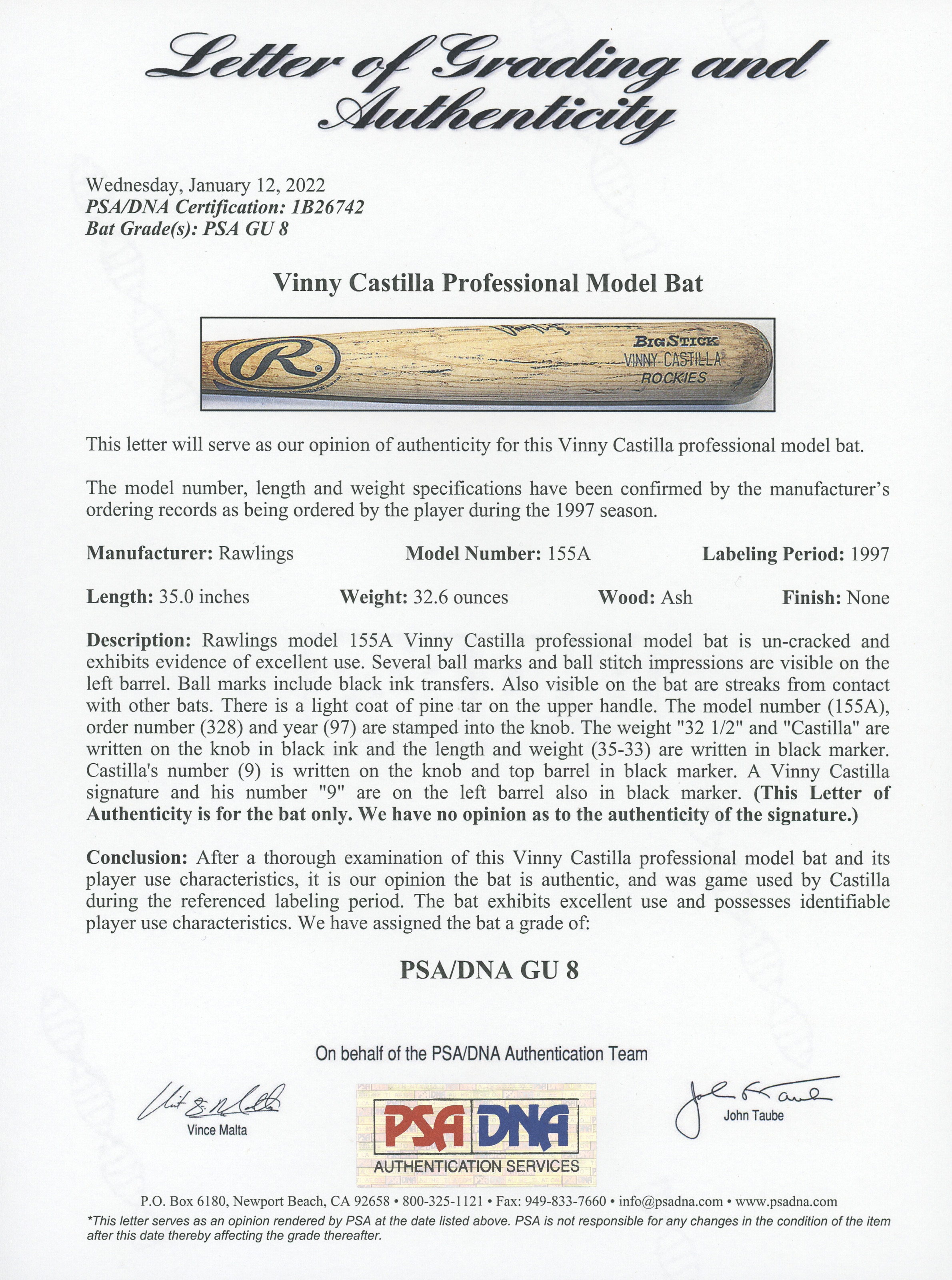 1997 Vinny Castilla Professional Model Bat: 35.0 inches/32.6 ounces Rawlings Model 155A that is uncracked with excellent use. Contact streaks and ball transfers with light pine tar on the upper handle. Uniform 9 is written on knob and top barrel with additional stamped/written details. Signed with no opinion on autograph authenticity – PSA/DNA GU 8;