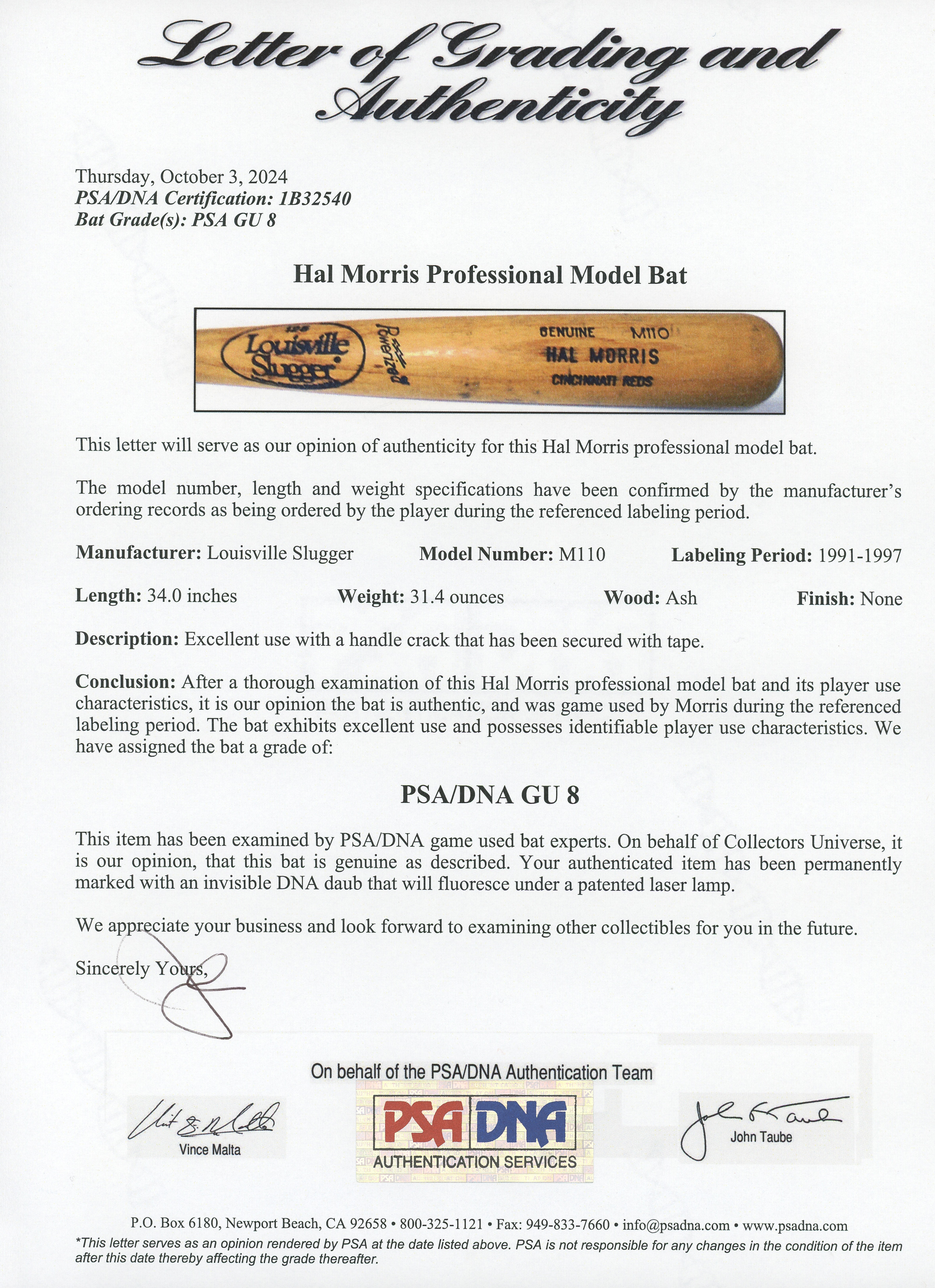 1991-1997 Hal Morris Professional Model Bat: 34.0 inches/31.4 ounces Louisville Slugger Model M110 with excellent use with handle crack secured by tape – PSA/DNA GU 8;